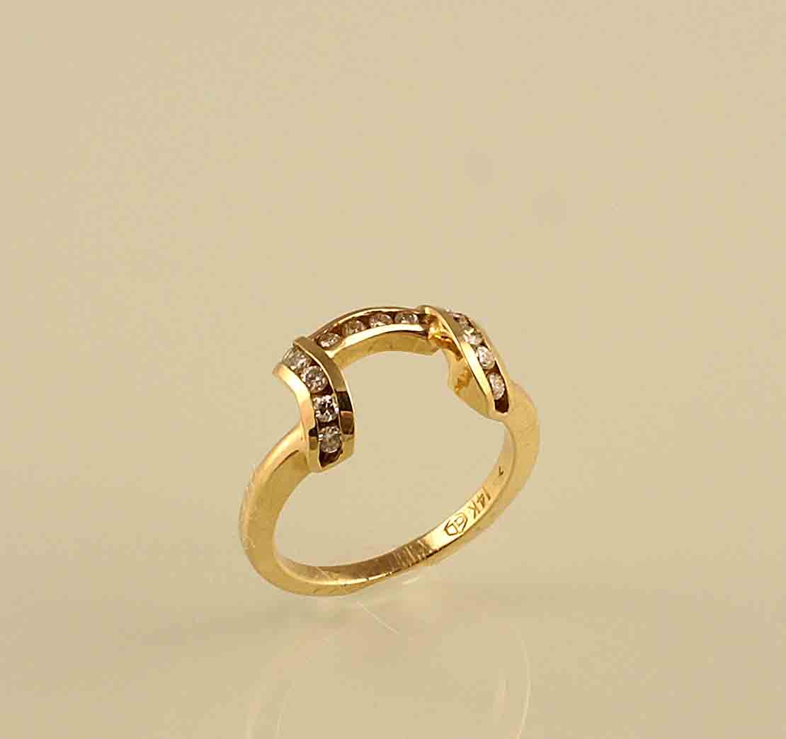 Anello in oro giallo 14kt con incastonati diamanti taglio brillante per 0,20 punti circa, gr. 3,2.