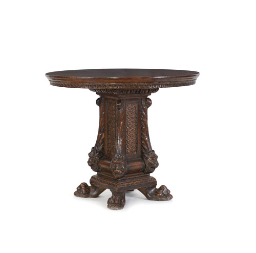 TAVOLO IN NOCE, XVI SECOLO, piano circolare con bordo dentellato applicato e sostegno centrale intagliato a leoni e motivi fitomorfi con profili modanati a più ordini su piedi ferini; restauri e adattamenti d'epoca successiva.