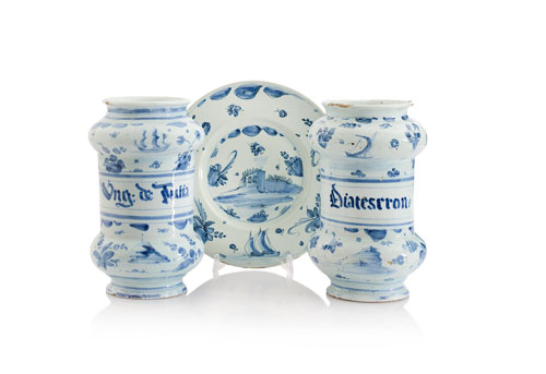 COPPIA DI ALBARELLI E UN PIATTO IN MAIOLICA, SAVONA, XVIII SECOLO, decoro blu con vegetazione e cartiglio con iscrizioni; marcati; sbeccature.