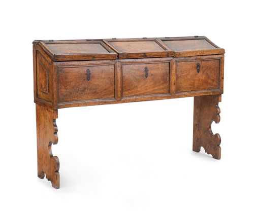 MOBILE LEGGIO IN NOCE, XVII SECOLO, fronte con piano tripartito con sportelli incernierati che danno accesso a vani, sostegni sagomati; adattamenti, sostituzioni e usure.