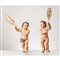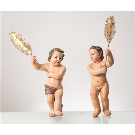 Coppia di putti in legno scolpito e laccato con occhi in vetro e piccole palme in metallo dorato.