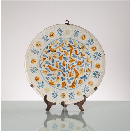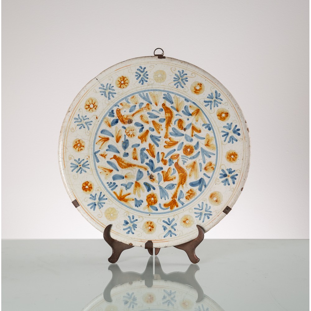 Piatto in maiolica policroma e smaltata nei toni del blu cobalto e giallo antimonio con al centro decorazioni di volatili (usure del tempo)