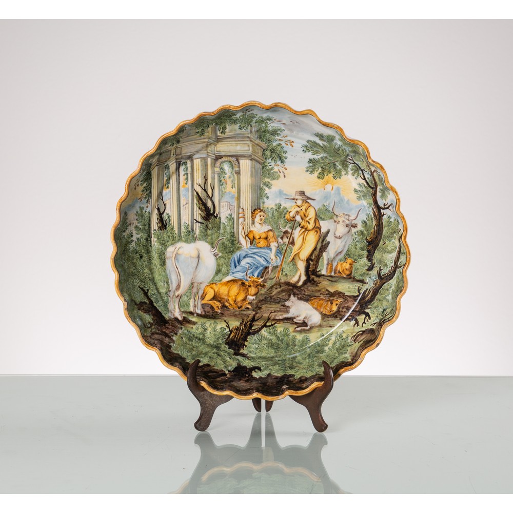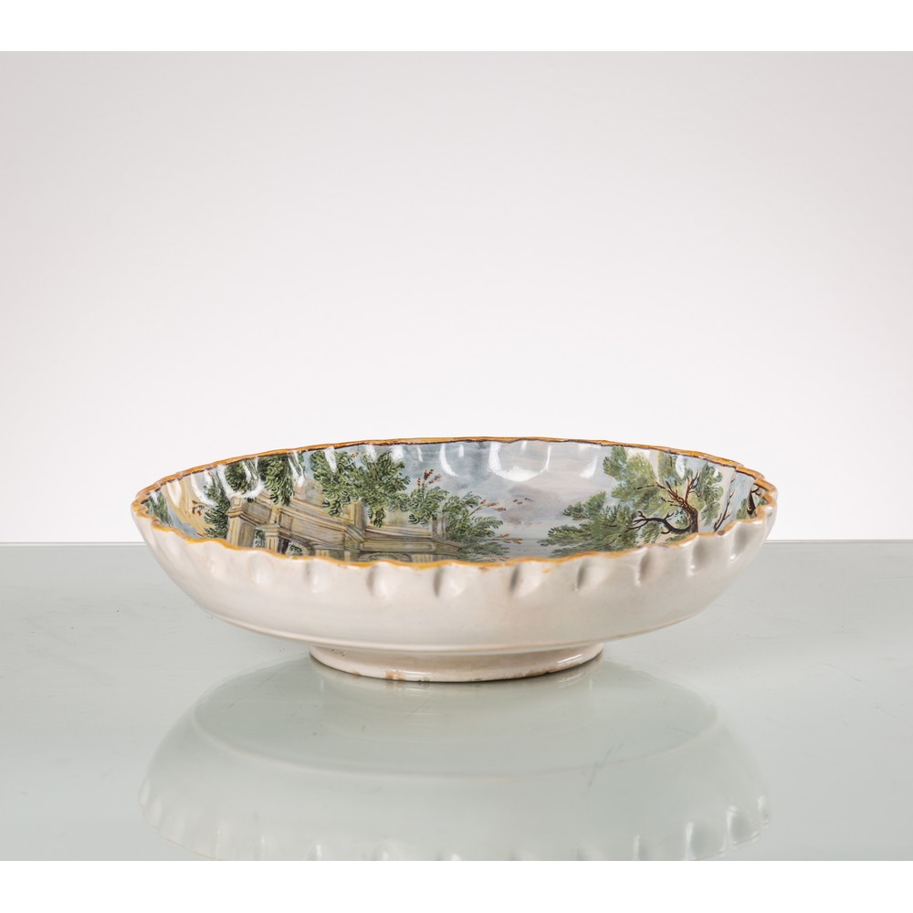 Crespina baccellata in maiolica policroma raffigurante "Pastori e armenti con rovine sullo sfondo" (restauri).