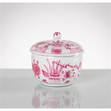 Zuccheriera in porcellana dipinta e decorata a motivi floreali (restauri).