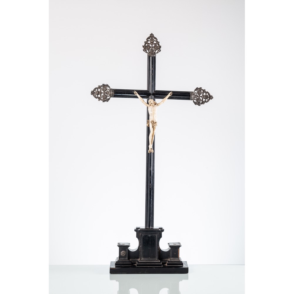 Crocifisso da appoggio in avorio con croce in legno ebanizzato e puntali in argento. Il crocifisso è corredato di certificato Cites.