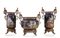 SET DI TRE VASI IN CERAMICA E METALLO BRUNITO, FRANCIA, FINE XIX SECOLO, biansati su piedi, decori con smalti policromi a figure femminili e oro su fondo blu; piccola scheggiatura al decoro.