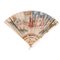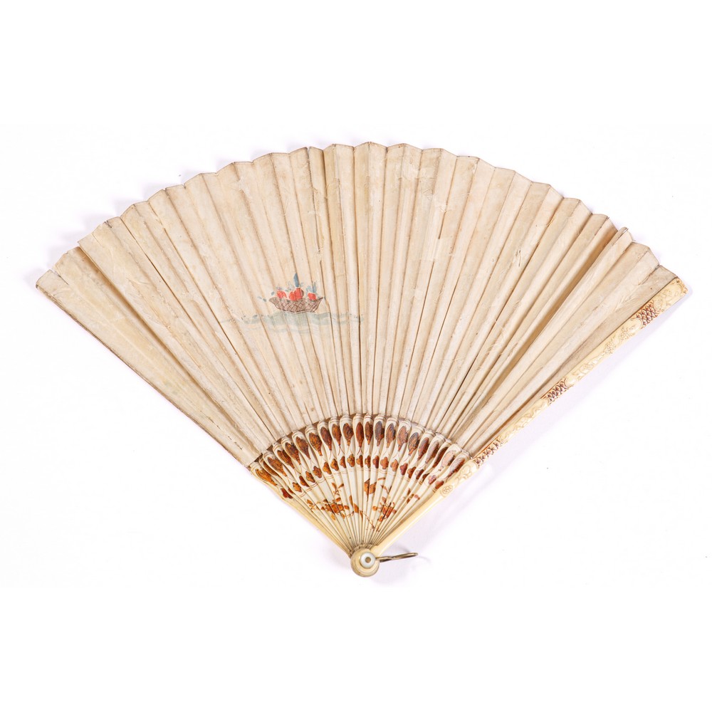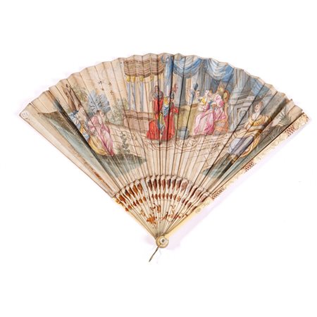 VENTAGLIO pieghevole con pelle di cigno interamente dipinta nella parte frontale con scena allegorica all'interno di un tempio romano con regina a colloquio con condottiero alla presenza di due guerrieri e cinque dame di alto lignaggio. I personaggi sono arricchiti nei particolari da tratti di dorature a zecchino. Nella parte destra della pagina una probabile firma “Aunir”. Ventitré stecche sagomate e laccate con uccelli e crostacei color nocciola. Stecche di guardia intagliate con motivi chinoiseries. Sul retro vi è dipinto un paniere con frutta policroma. Fermaglio in oro bloccato da due perni di madreperla.