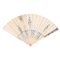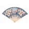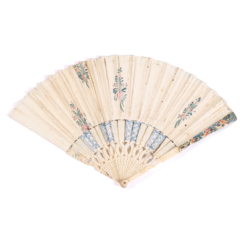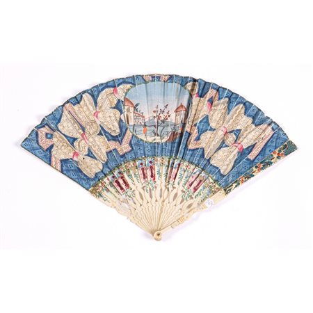 VENTAGLIO fornito di venti stecche sagomate, traforate, dipinte e centrate da lustrini color rosso e color oro. Stecche di guardia incise e decorate. Pagina in pelle di pollo decorata con un grande medaglione con paesaggio policromo sostenuto ai lati da sei scocche colorate, il tutto su un fondo blu-grigio quadrettato e picchiettato.