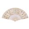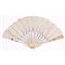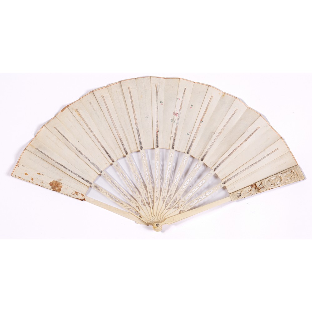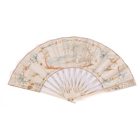 VENTAGLIO da mattina con stecche traforate e dipinte con motivi floreali. Pagina in pelle di pollo interamente dipinta e centrata da scena galante.