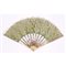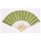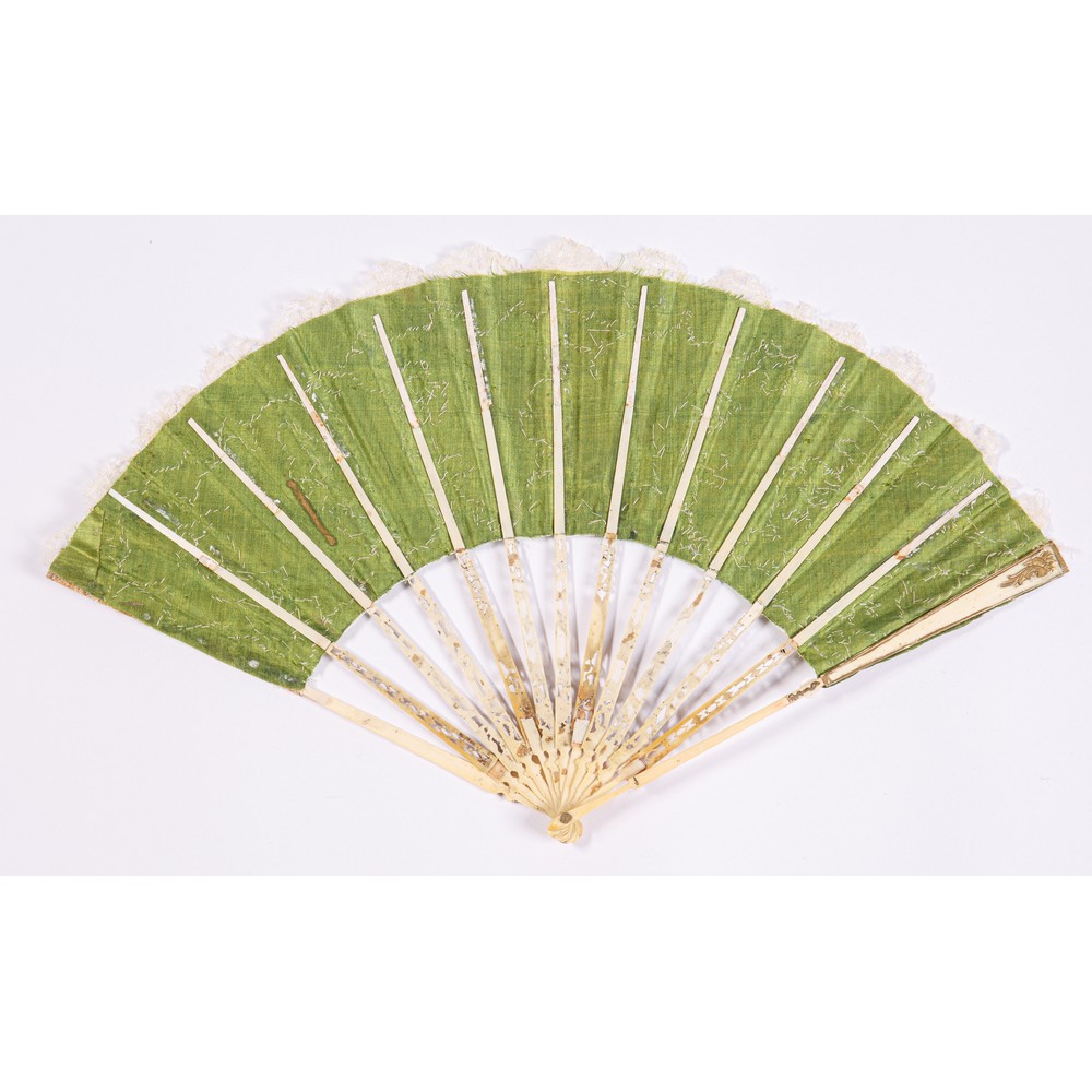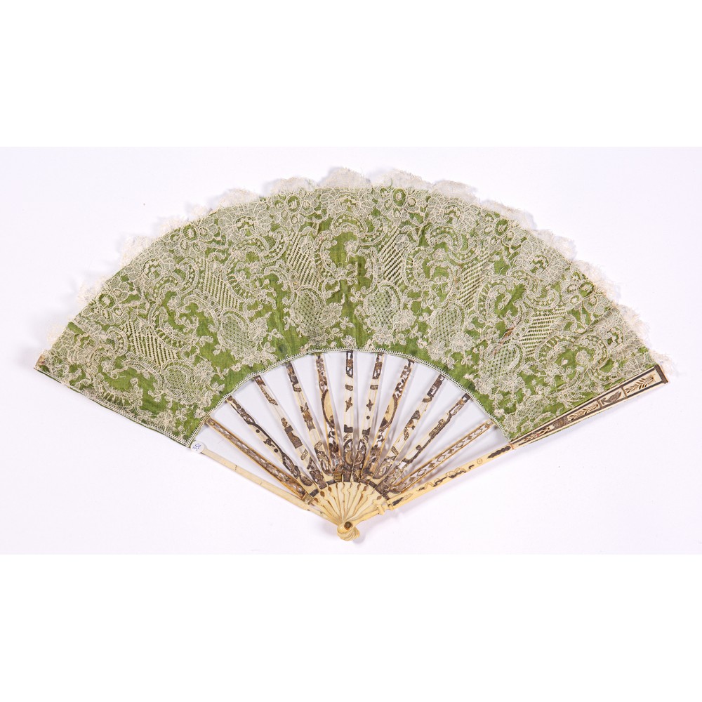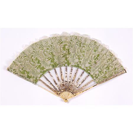 VENTAGLIO da mattina fornito di tredici stecche traforate e incise con motivi floreali, intagli decorativi di festoni, cartigli, uccelli e cuori lumeggiati in argento e oro. La pagina è in seta color verde tenue rivestita da un vasto bordo appuntato di pizzo ai fuselli.