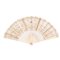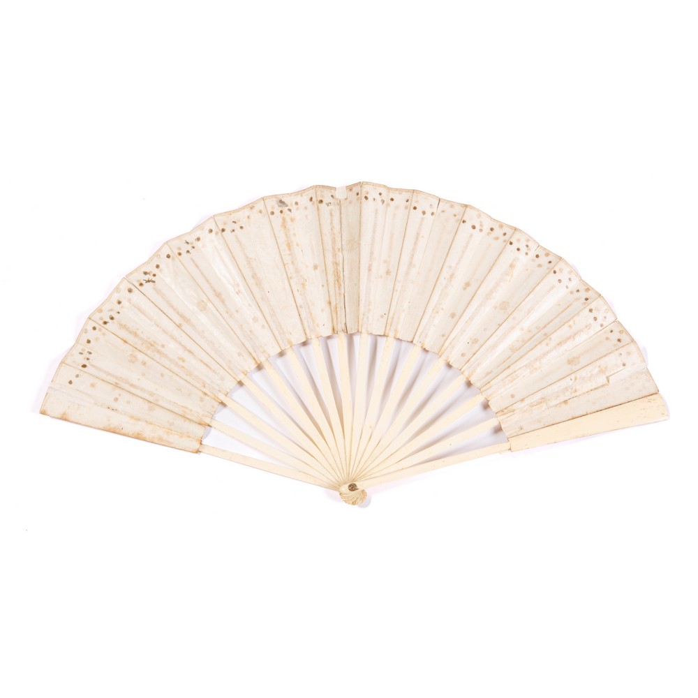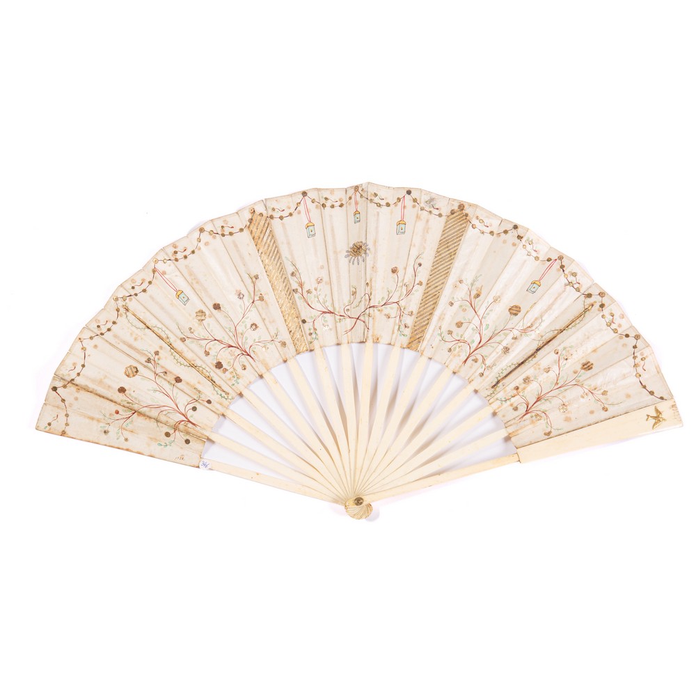 VENTAGLIO da mattina, fornito da sedici stecche, pagina in pelle di volatile decorata con motivi floreali policromi, paillettes, trame in canutiglia d’oro e d’argento, fiori e cestini. Pagina puntellata da un grande festone che la contorna tutta, cui sono appese cinque piccole lanterne.