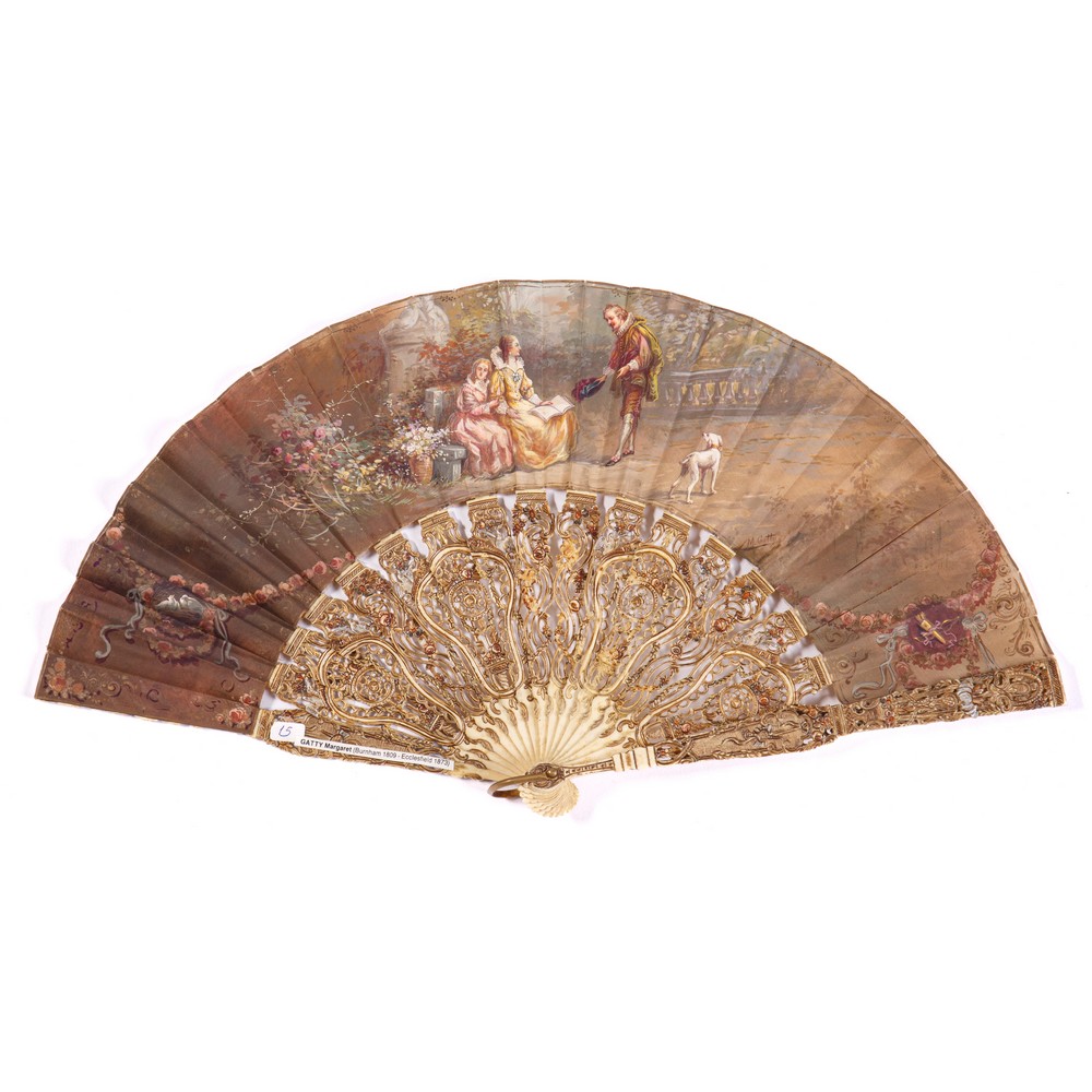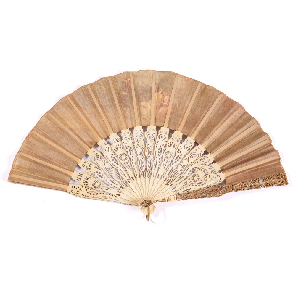 VENTAGLIO da sera fornito di diciotto stecche traforate, intagliate e decorate a merletto, quattro pannelli oblunghi puntellati da uccelli e intervallati da rabeschi floreali ,fiori policromi cornucopie, festoni. Pagina in seta dipinta in policromia con scena galante di ispirazione seicentesca con dama, cavaliere, giovane e cane.