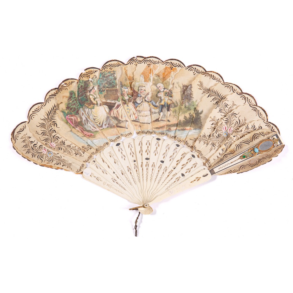 VENTAGLIO tipo brisè con pagina in seta dipinta con scena galante incorniciata da rabeschi.