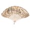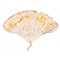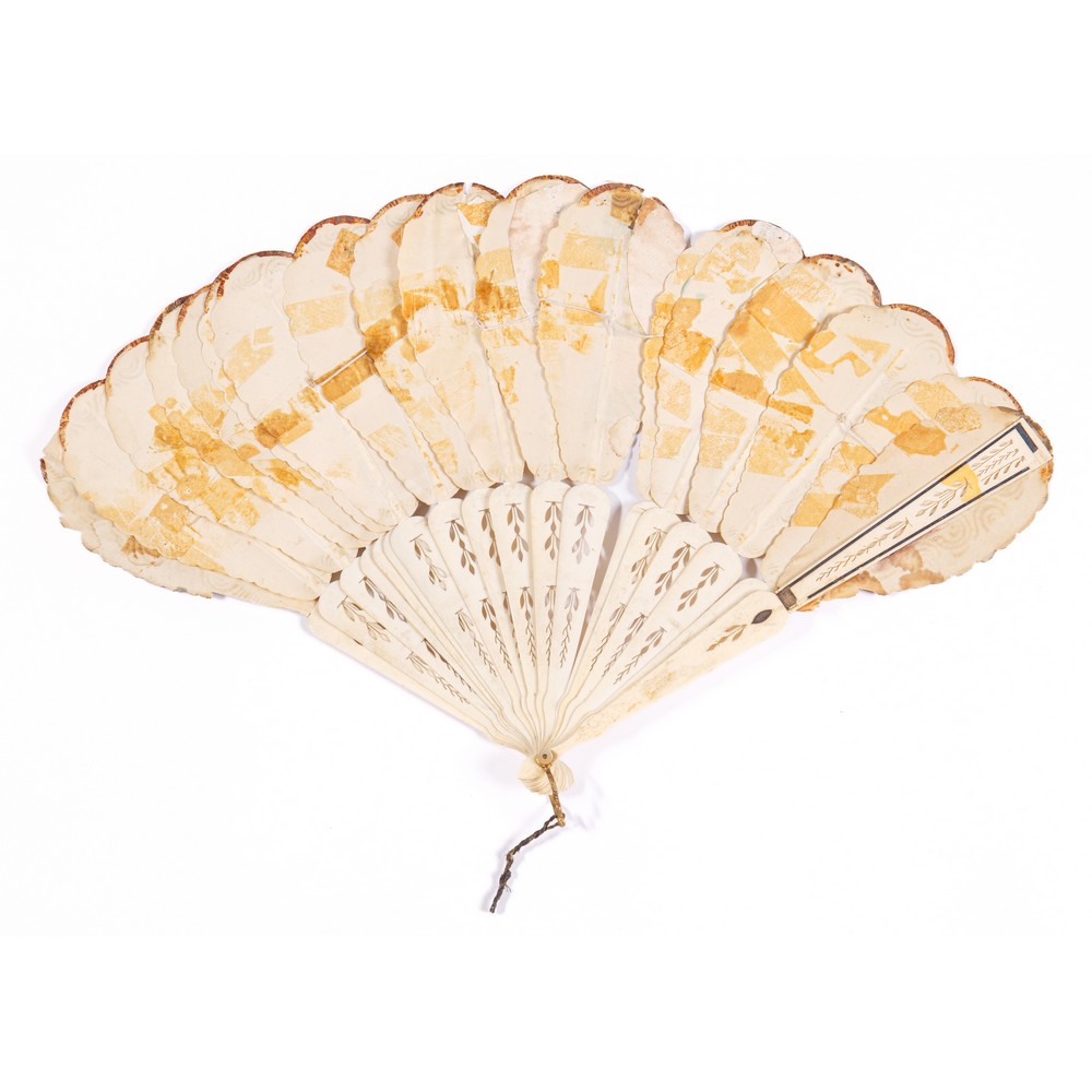 Stecche incise traforate e decorate a lustrini chiuse nel movimento dal fermaglio con fiocco in legno dorato, fili di seta ed argento.