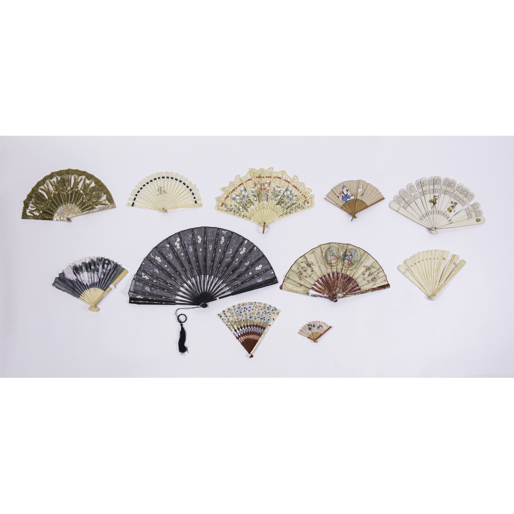 Ventaglio brisé fornito di sedici stecche in papier-machè laccate color panna, traforate arabeschi e congiunte da passamaneria di pizzo. Nella parte frontale due vignette con personaggi maschile e femminile in paesaggio bucolico.