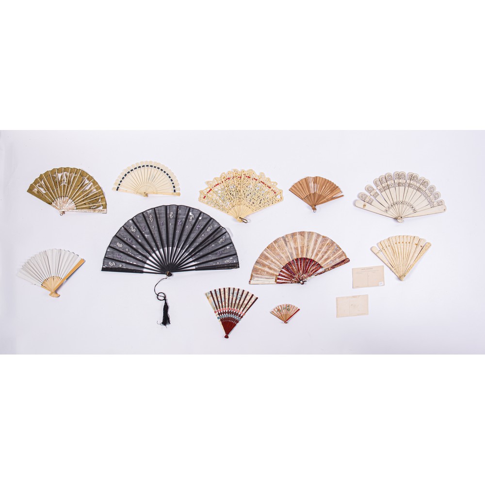 Ventaglio brisé fornito di quattordici stecche traforate a motivi floreali dipinte, fiori e foglie