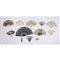 La decorazione è affidata a una teoria fastosa di paillettes, lustrini e applicazioni in oro. Le stecche nel numero di diciotto sono in madreperla incisa e decorata da lumeggiature e paillettes dorate.