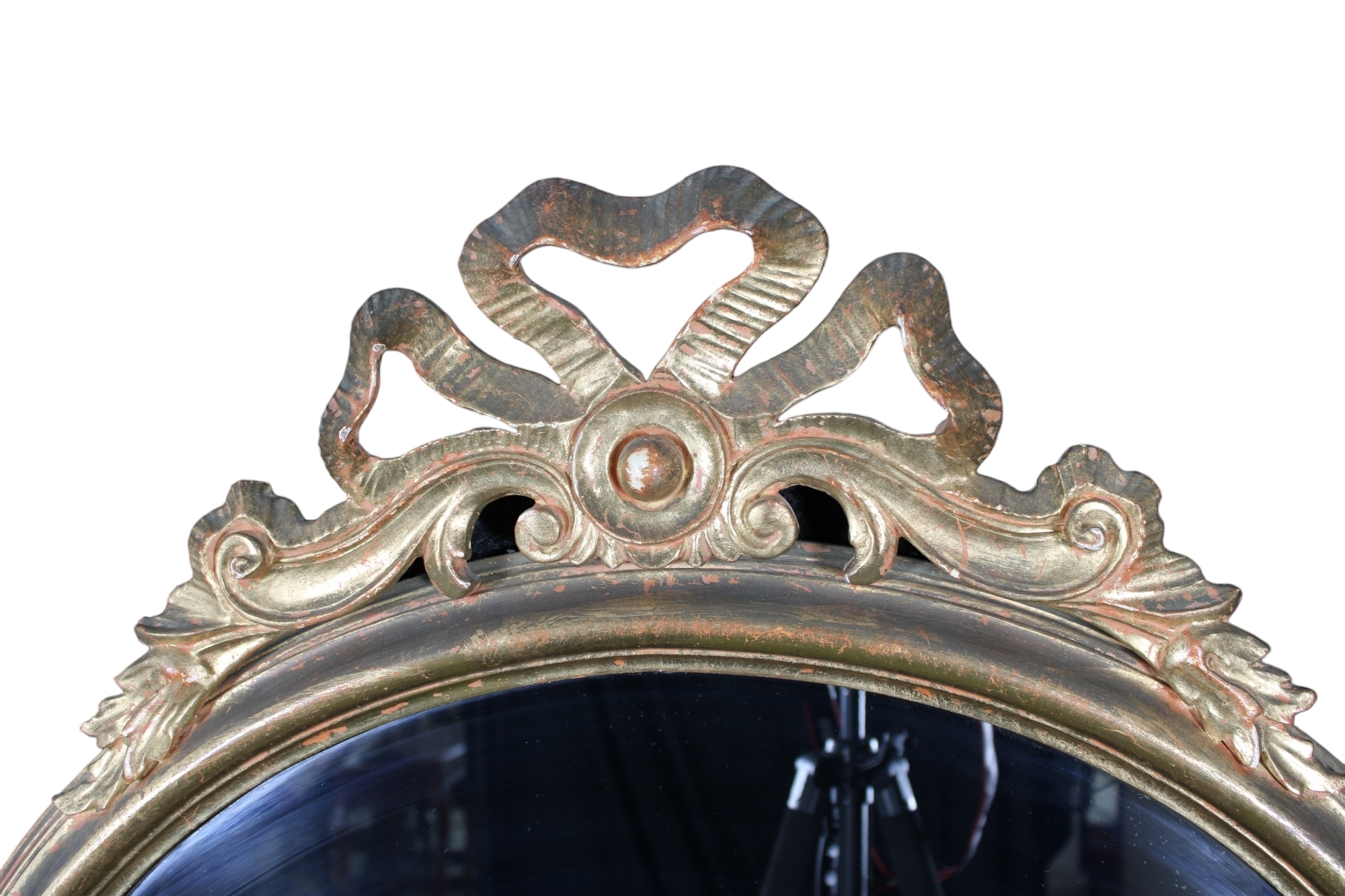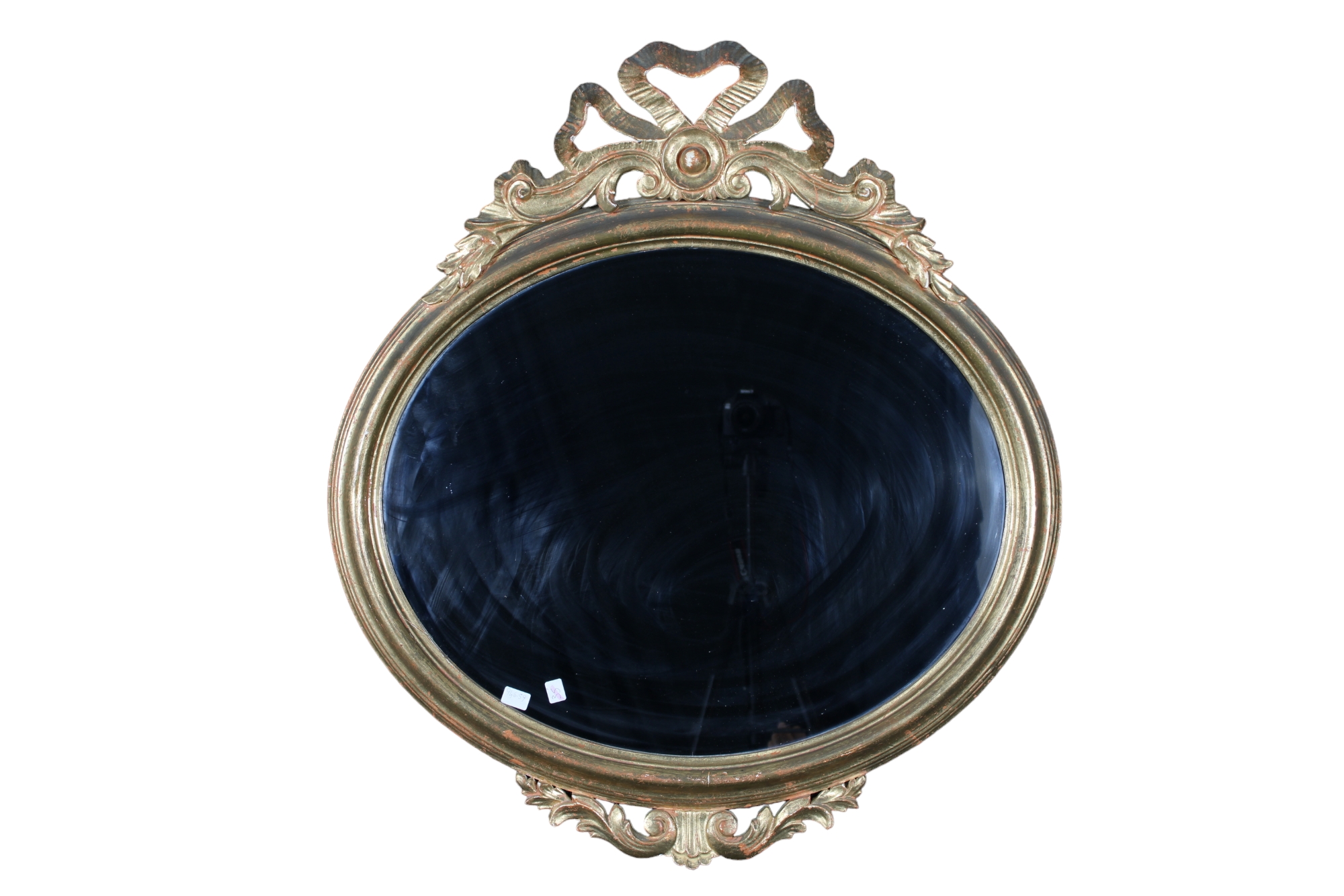 SPECCHIERA OVALE VINTAGE con cornice dorata e decorata da cimasa intagliata soggetto il nodo d'amore Sicilia XX secolo h cm 84 x 75