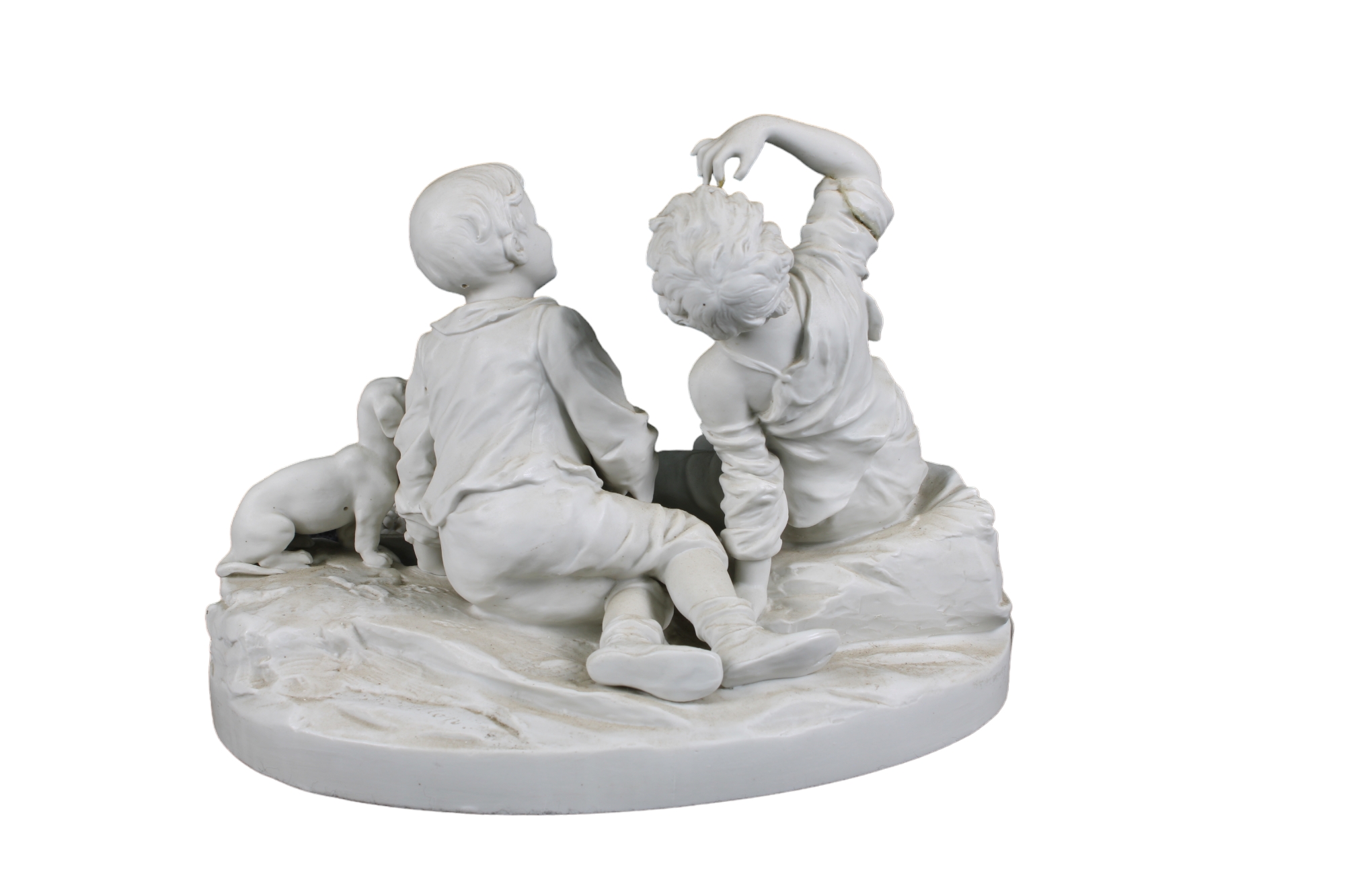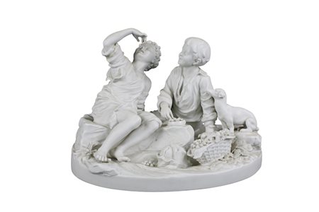 GRUPPO in porcellana raffigurante 2 fanciulli firmato Walton XX secolo h cm 23 x 31 x 25
