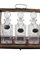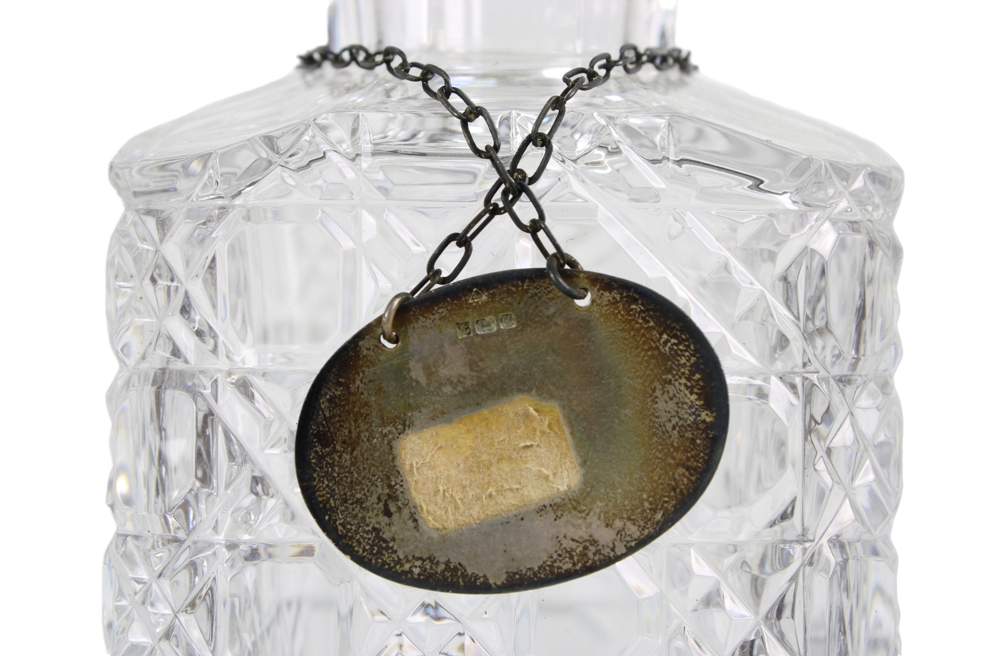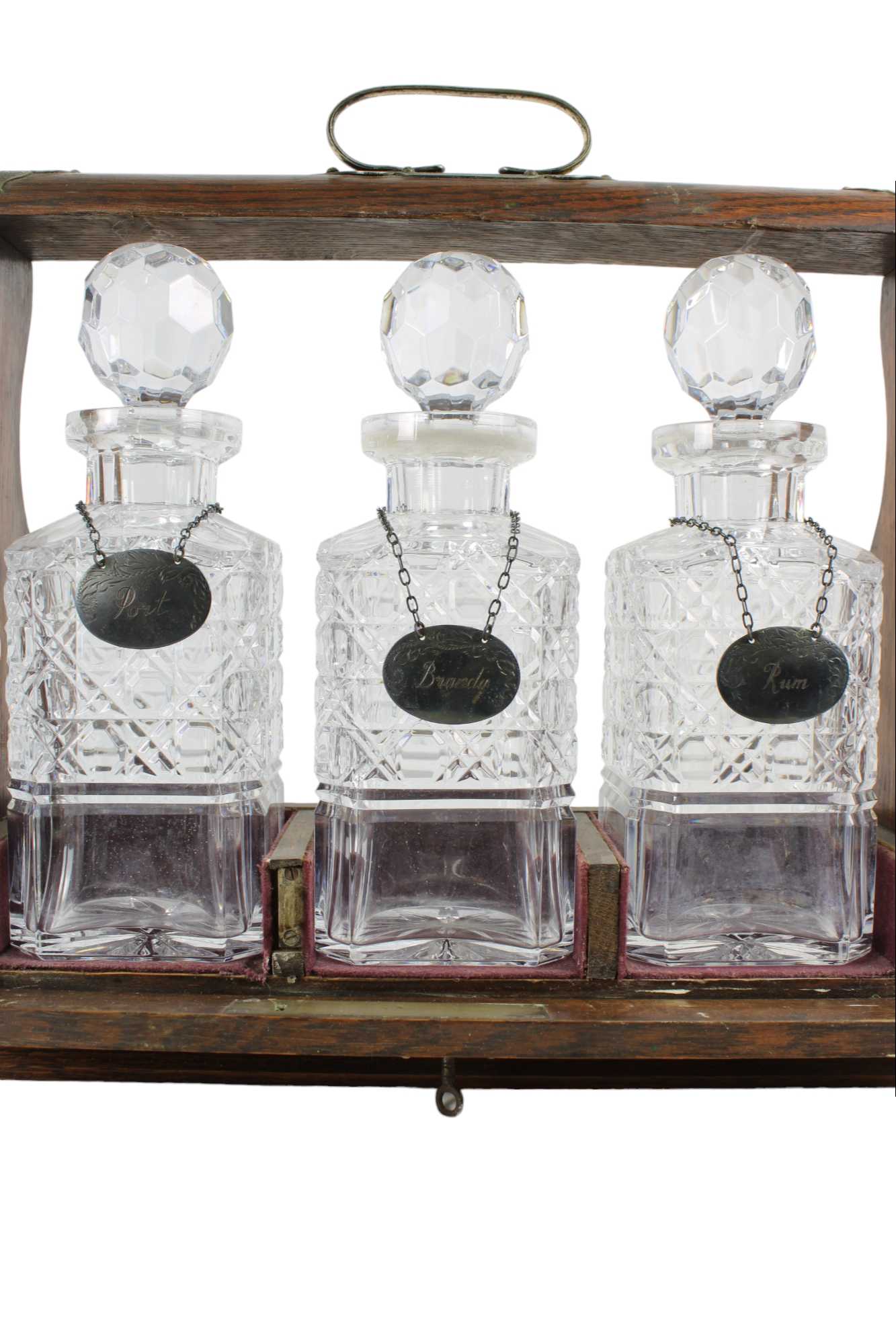 BOX in legno di rovere contenente 3 bottiglie da liquore in cristallo intagliato e collarino in argento vintage inglese h cm 33 x 35 x 13