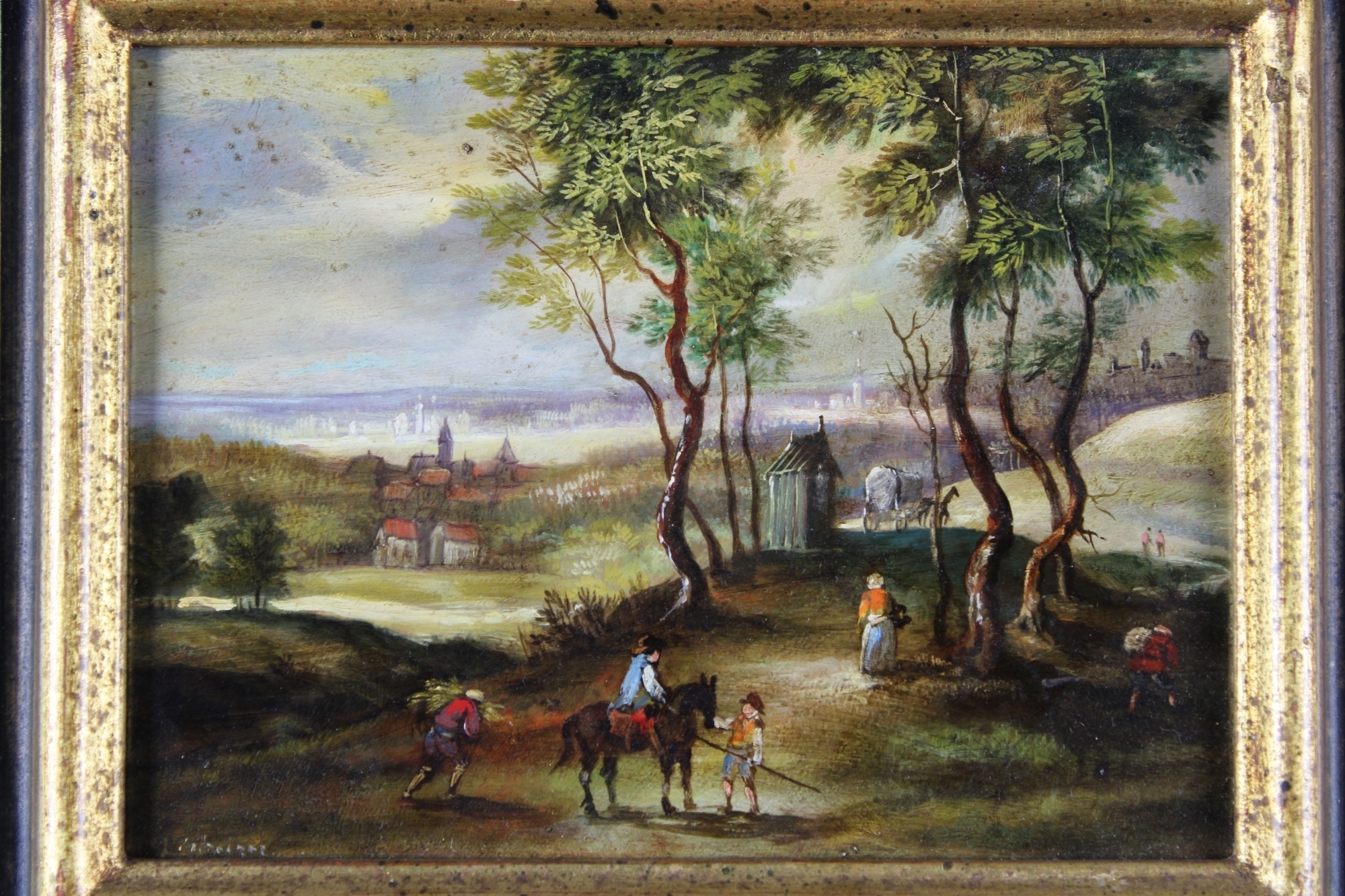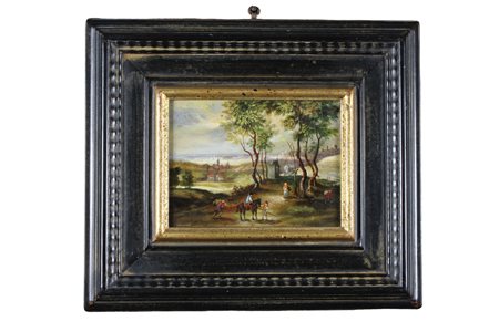 DIPINTO OLIO SU RAME raffigurante paesaggio con personaggi dentro cornice Italia XIX secolo h cm 14 x 19 / cornice h cm 33 x 38