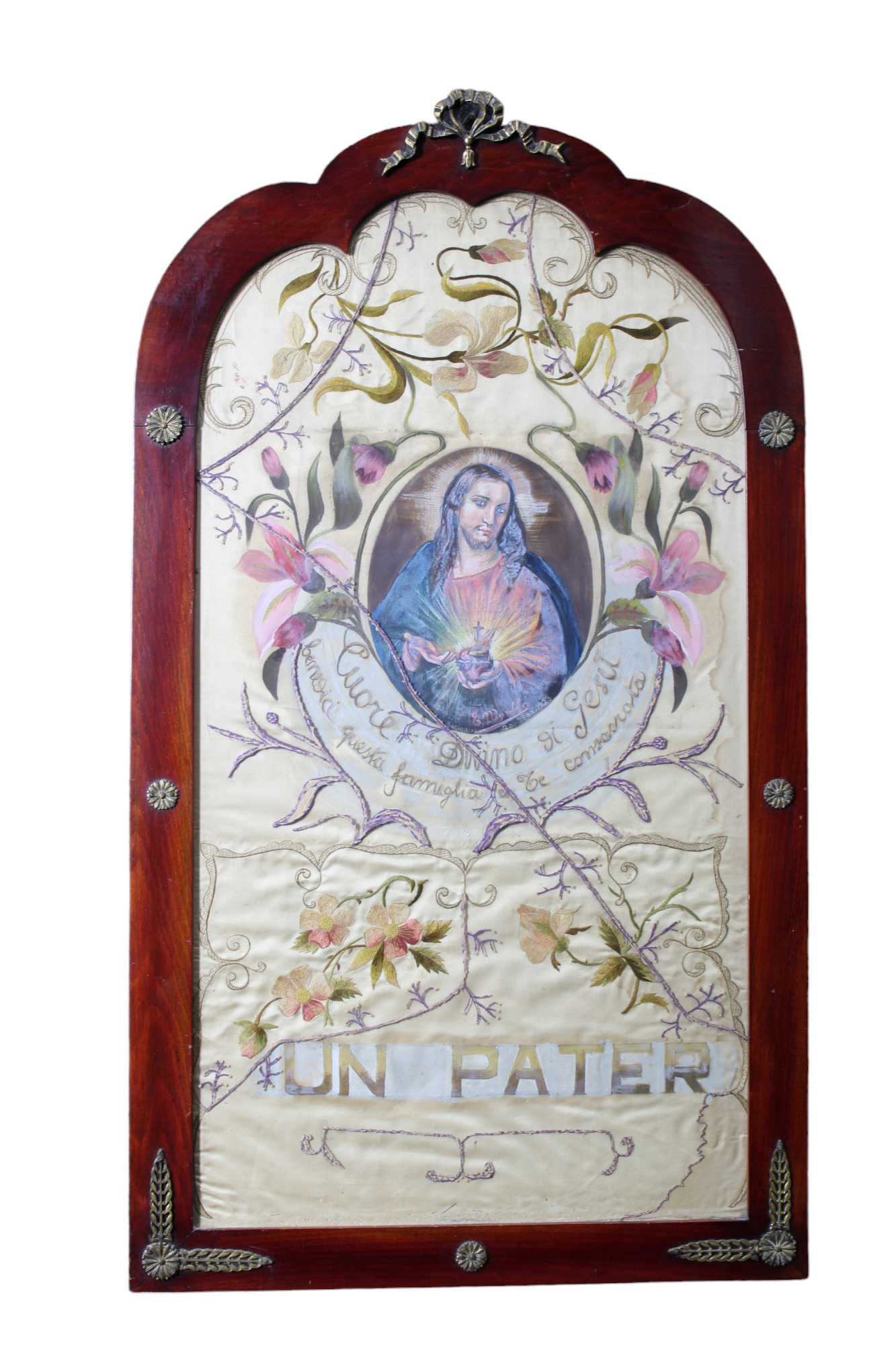 PANNELLO in seta dipinta e ricamata con al centro raffigurato il Sacro Cuore di Gesù con dedica firmato e datato cornice in mogano e piccoli bronzi h cm 99 x 56