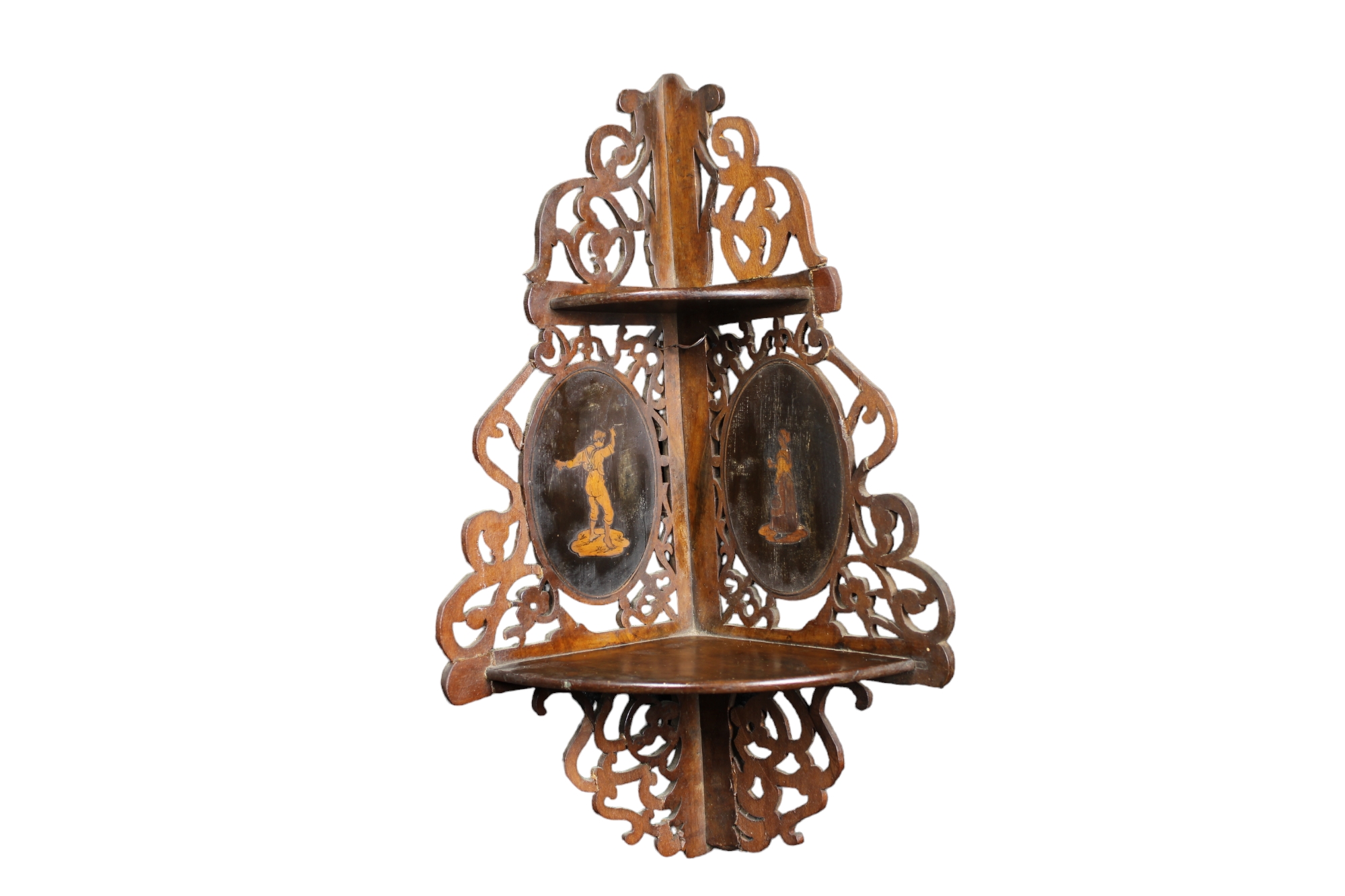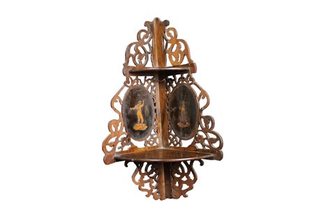 PICCOLA ANGOLIERA SORRENTINA in legno traforato e intarsiato Sorrento XIX secolo h cm 50 x 28 x 20