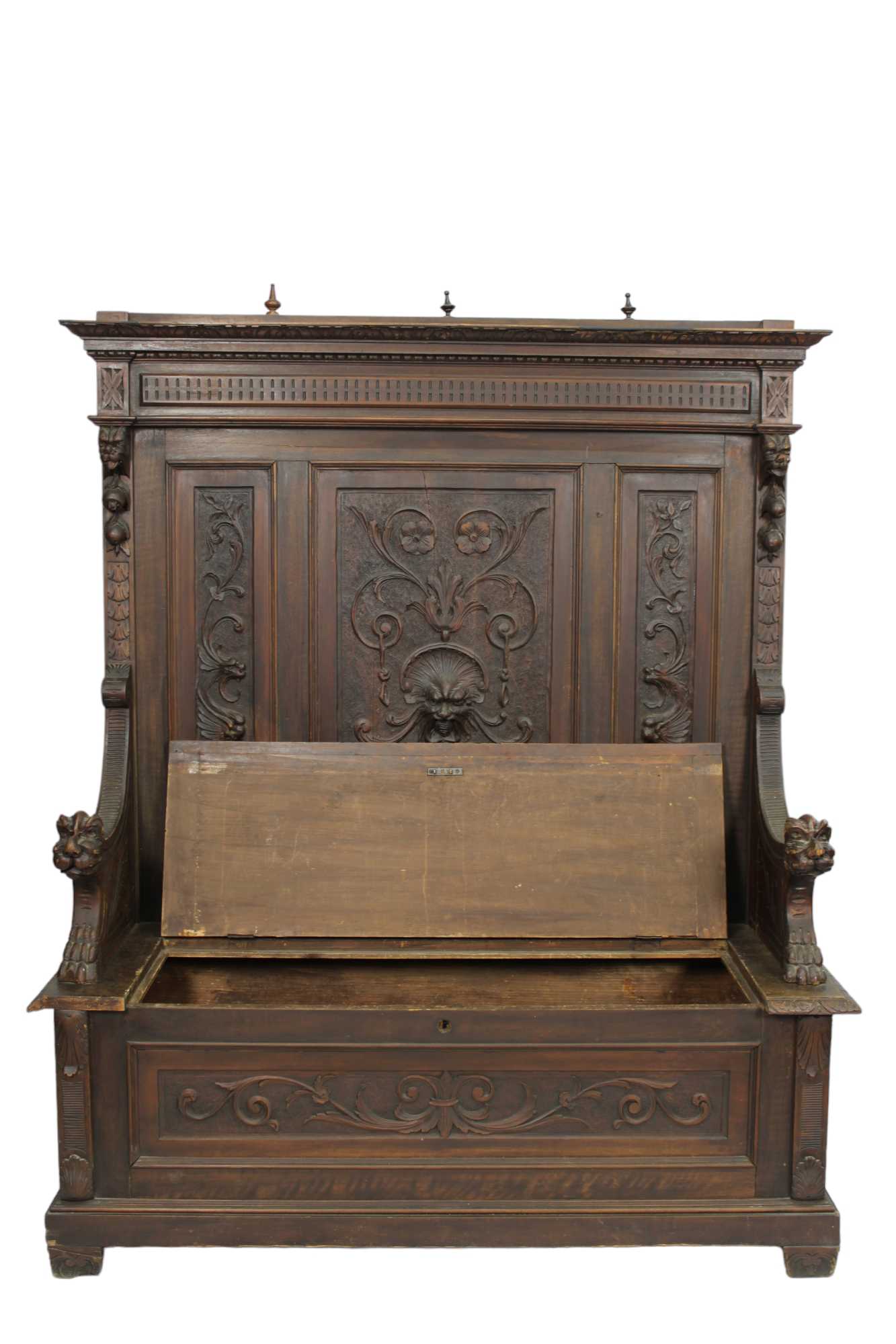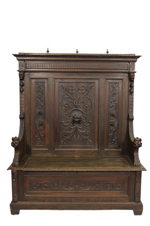CASSAPANCA in noce stile rinascimento con spalliera Sicilia primi 900 h cm 68 x 140 x 53