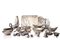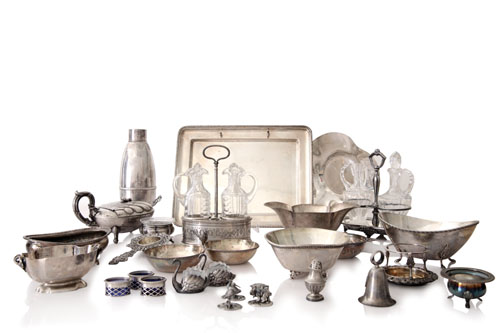 LOTTO DI DIVERSI OGGETTI IN ARGENTO, XX SECOLO, composto da due oliere diverse, uno shaker, una formaggiera, un campanello, sette ciotole a centrotavola diverse, un vassoio porta formaggi, un colino, una ciotola bivalve, un porta bicchiere, un set di sei salierine con vetro blu, un set di sei segnaposto con animaletti, due saliere a cigno e cinque saliere di diversa forma; difetti, mancanze e ammaccature.