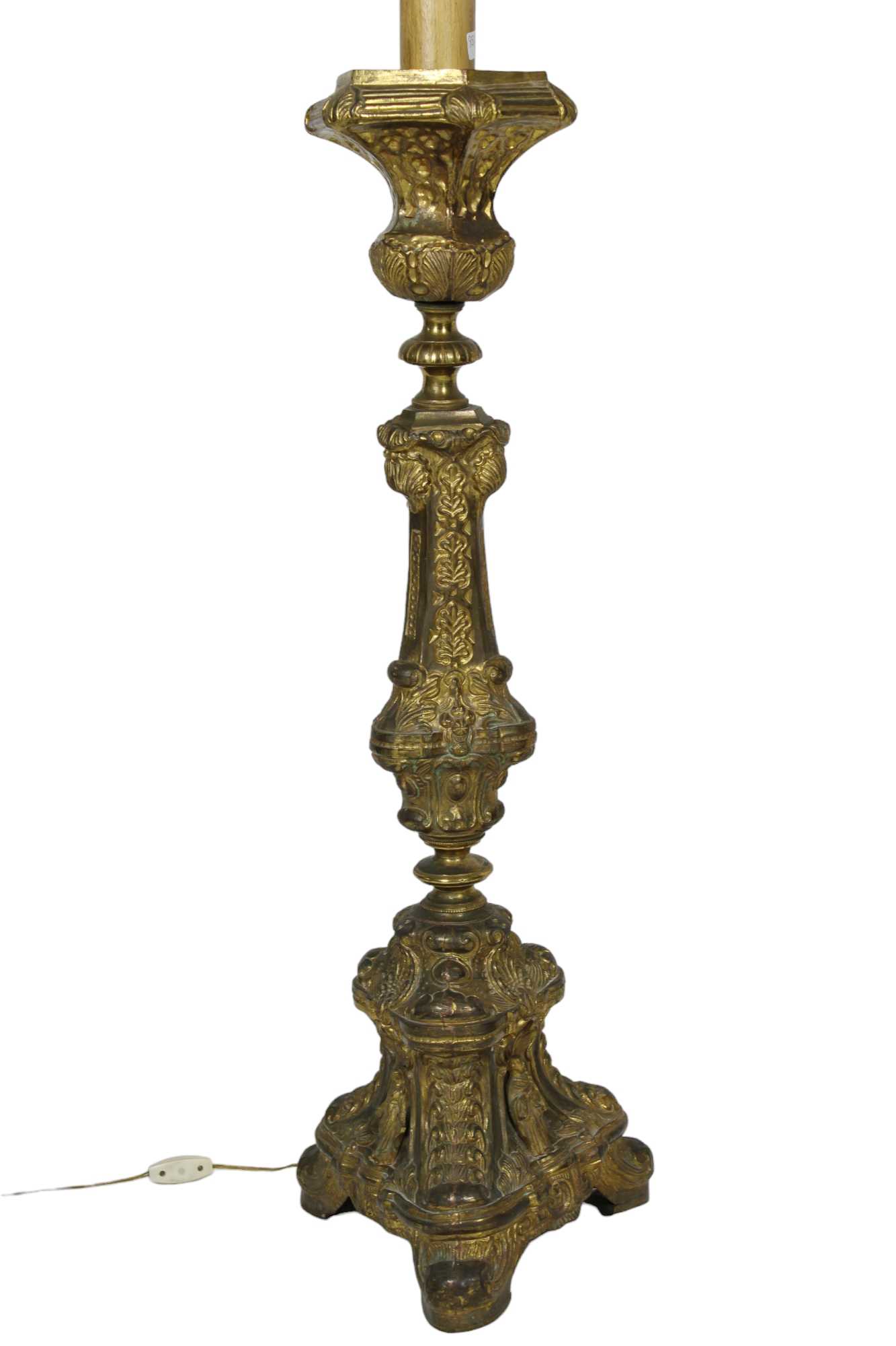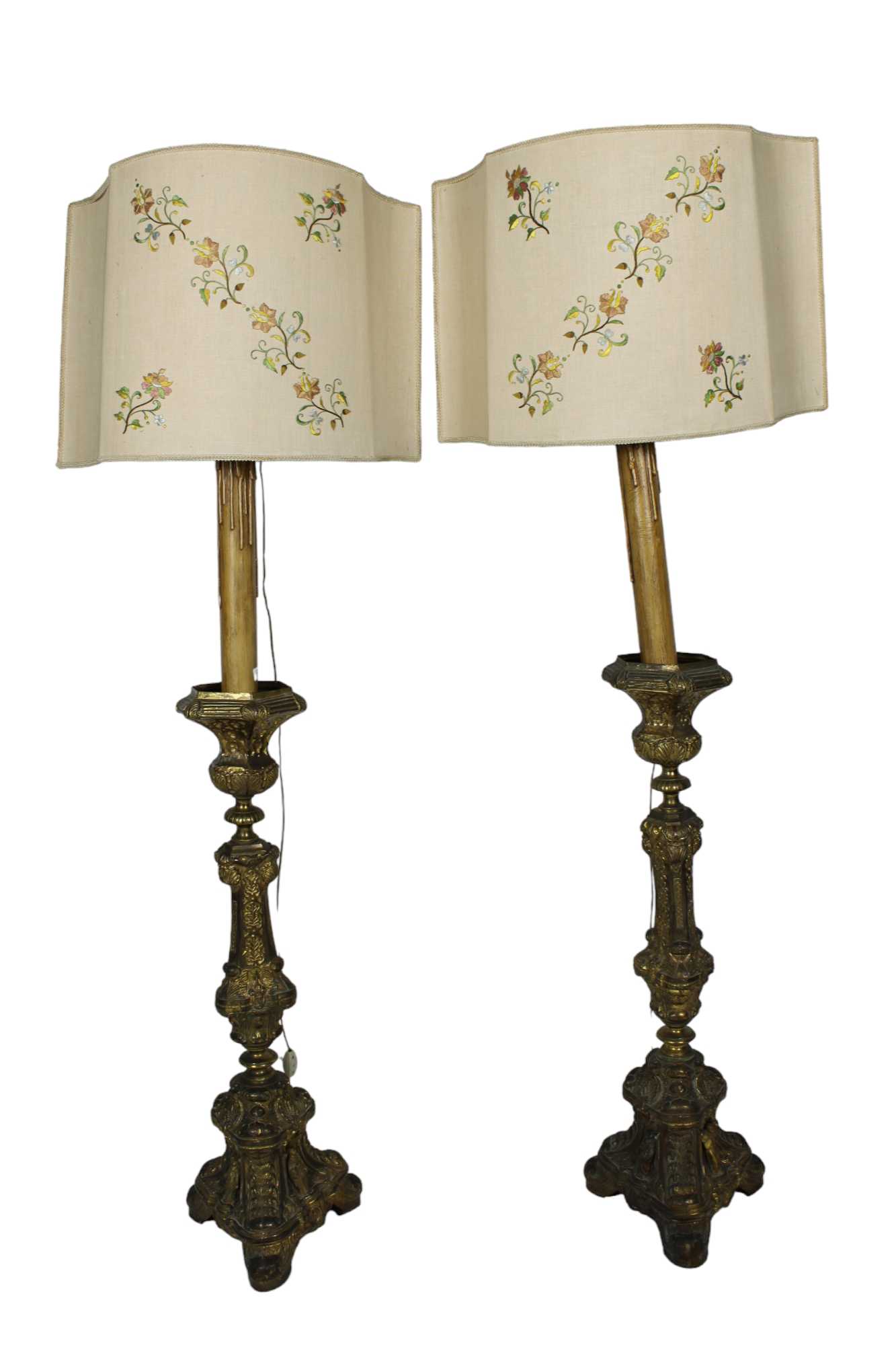 COPPIA DI TORCIERI in ottone sbalzato e cesellato elettrificati e corredati da ventole con applicazioni a soggetto floreale Sicilia XIX secolo h cm 151 x 48