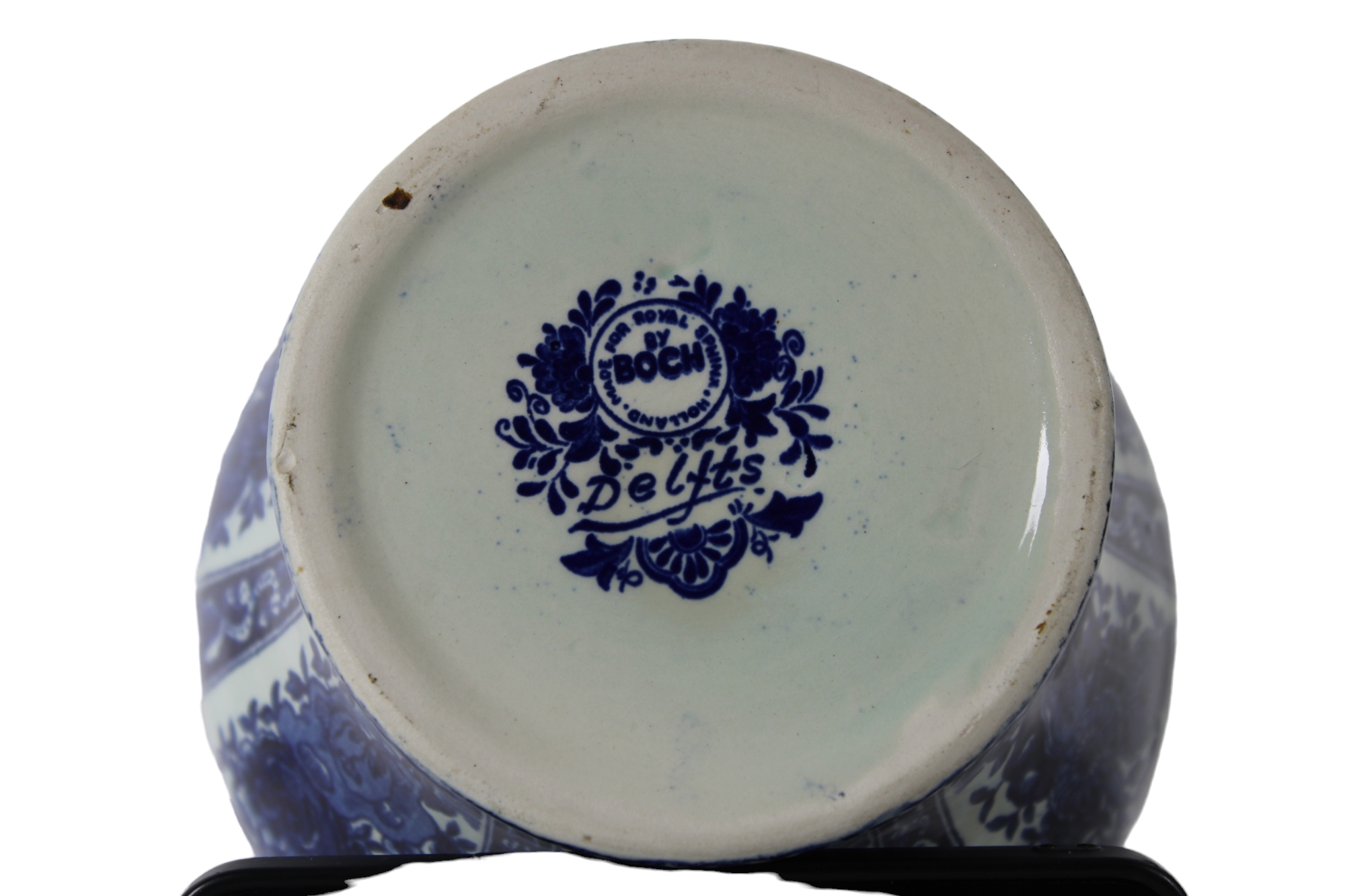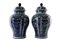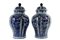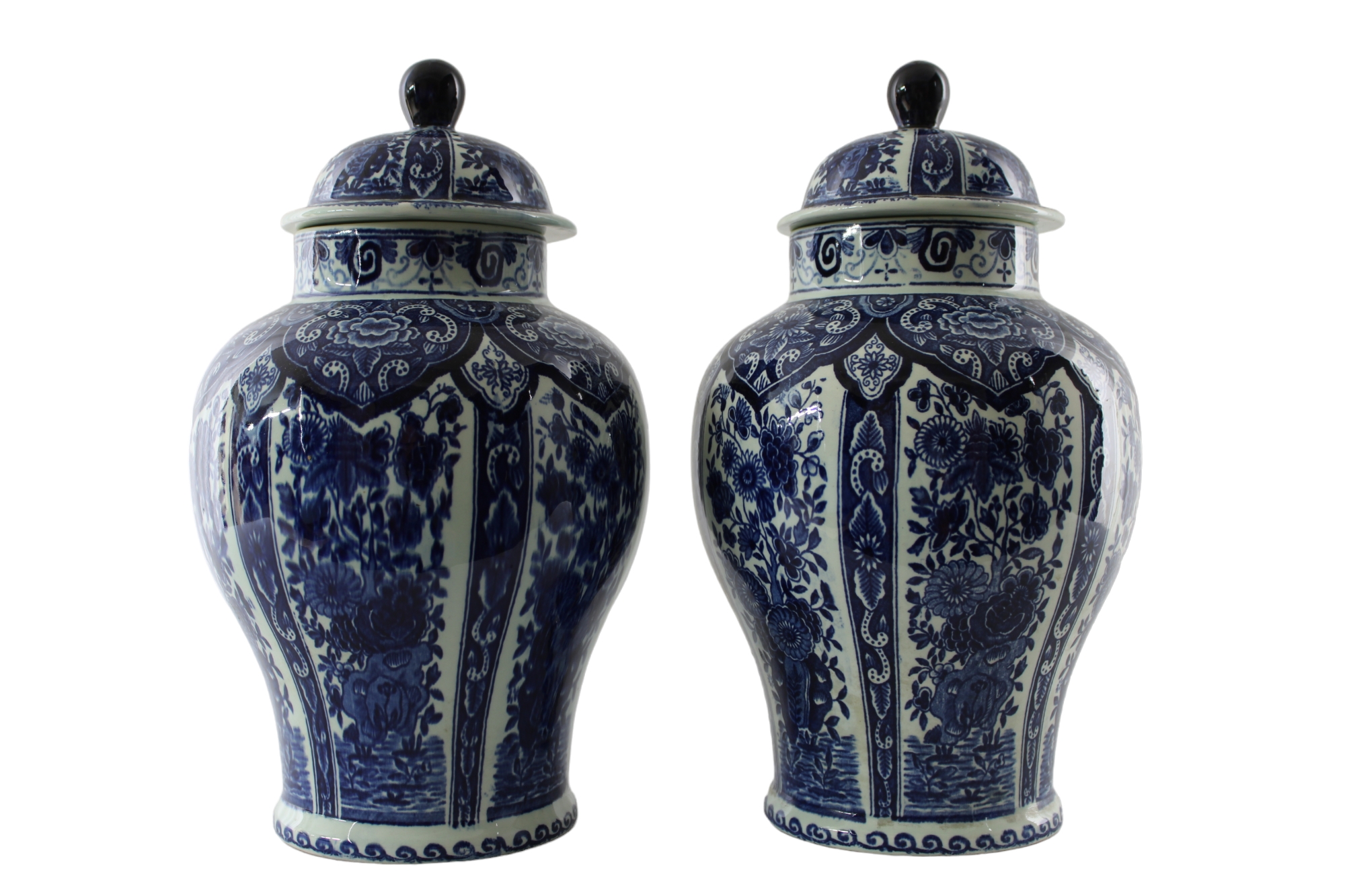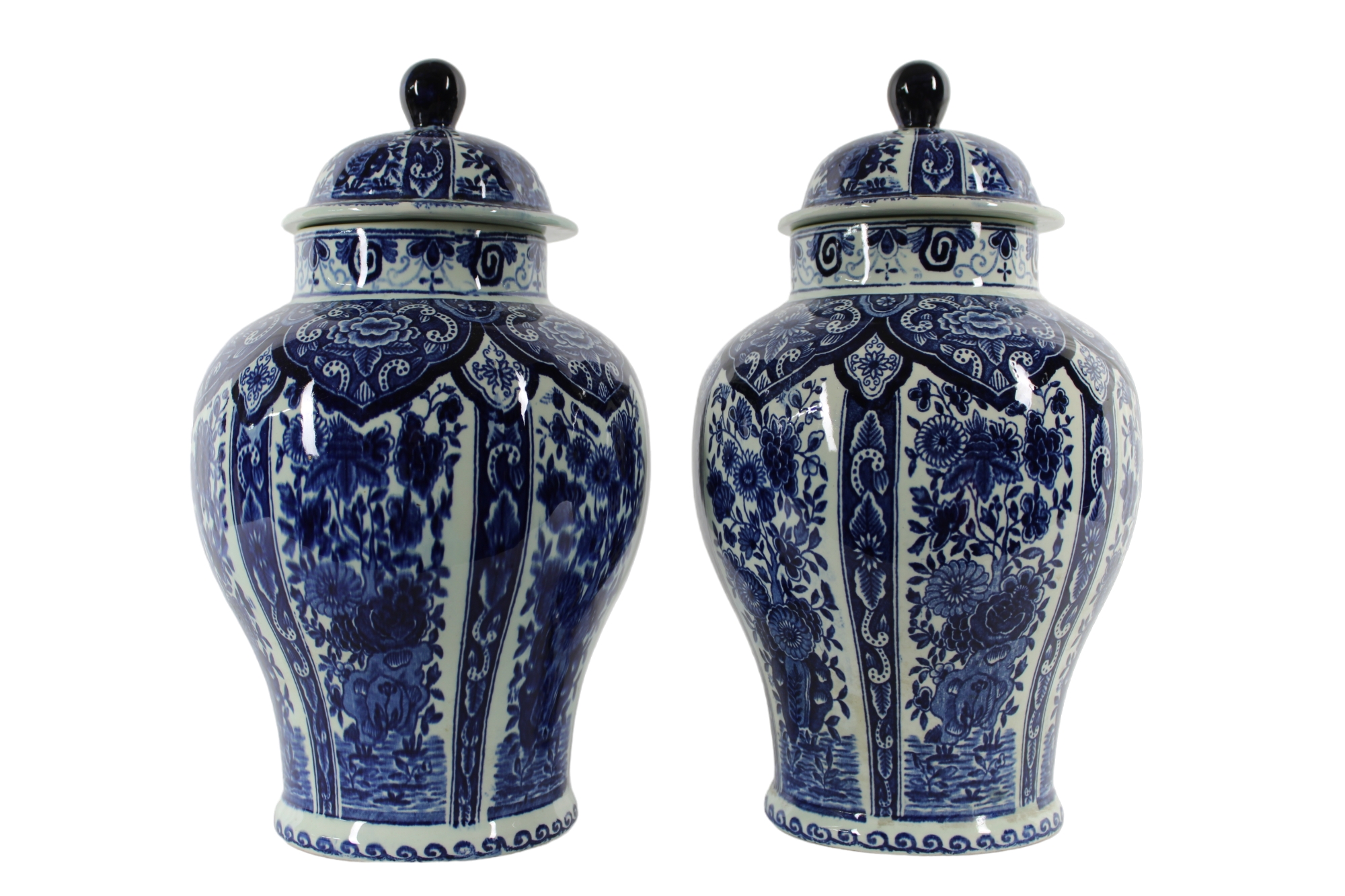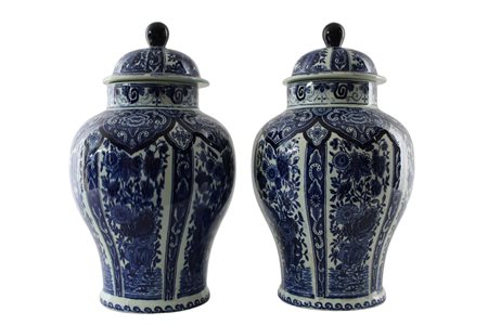 COPPIA POTICHE CON COPERCHI in porcellana dipinta a motivi floreali di gusto orientale manifattura Delfts by Boch Olanda XX secolo h cm 32 x 18