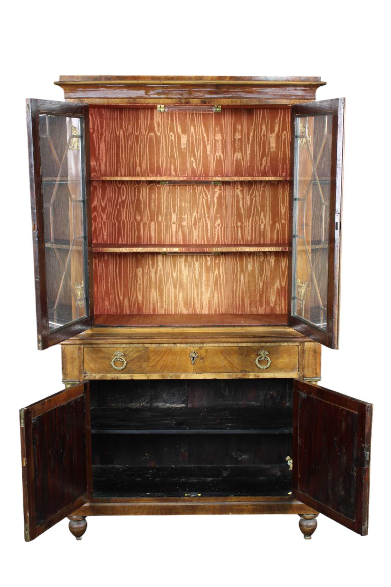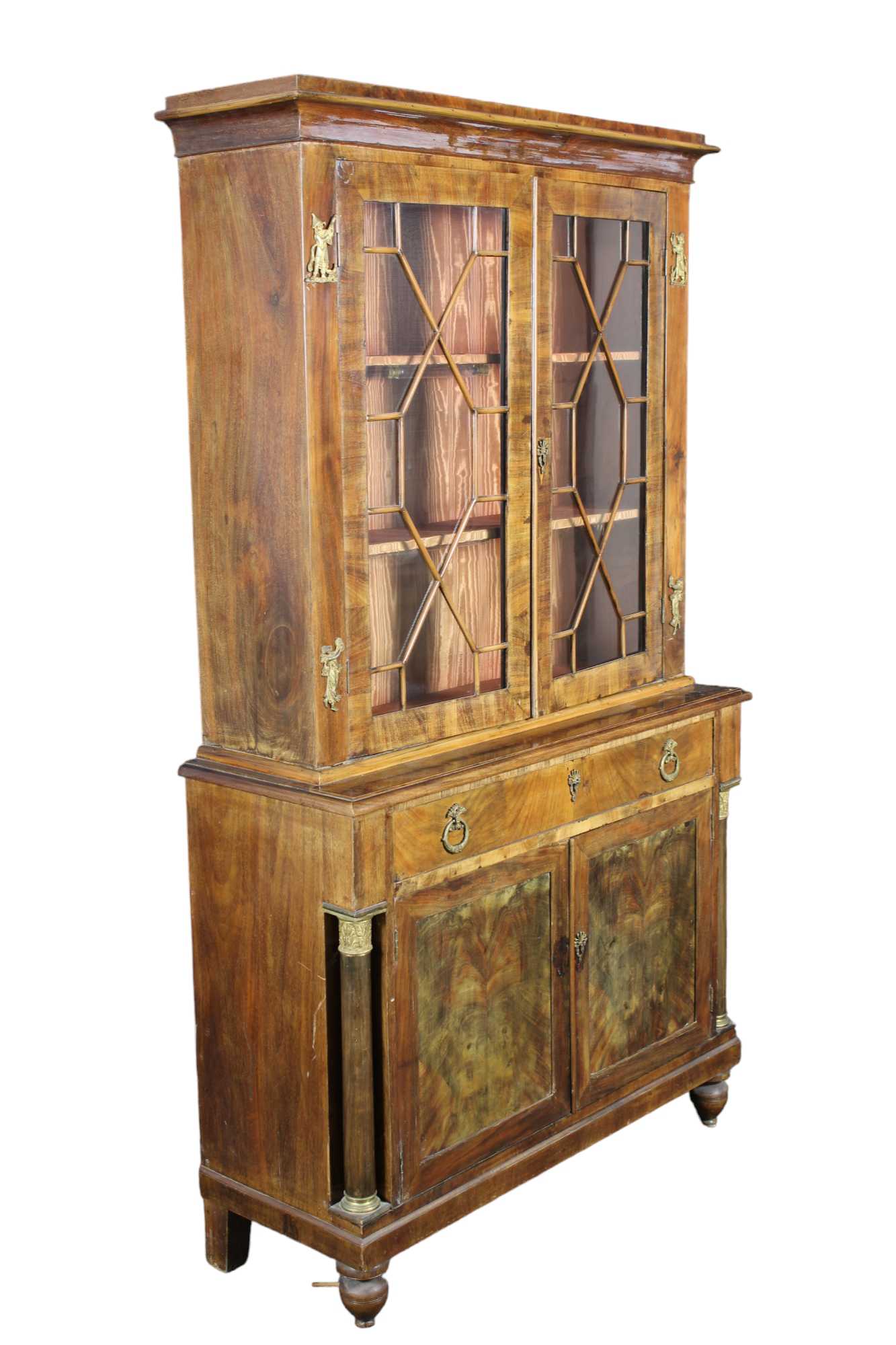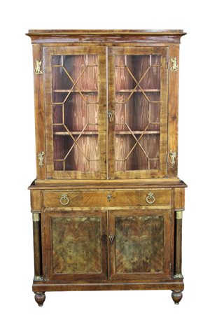VETRINA DOPPIO CORPO in piuma di mogano , arricchita da colonne, capitelli e applicazioni in bronzo Sicilia fine XIX secolo h cm 175,5 x 98,5 x 36,6