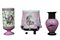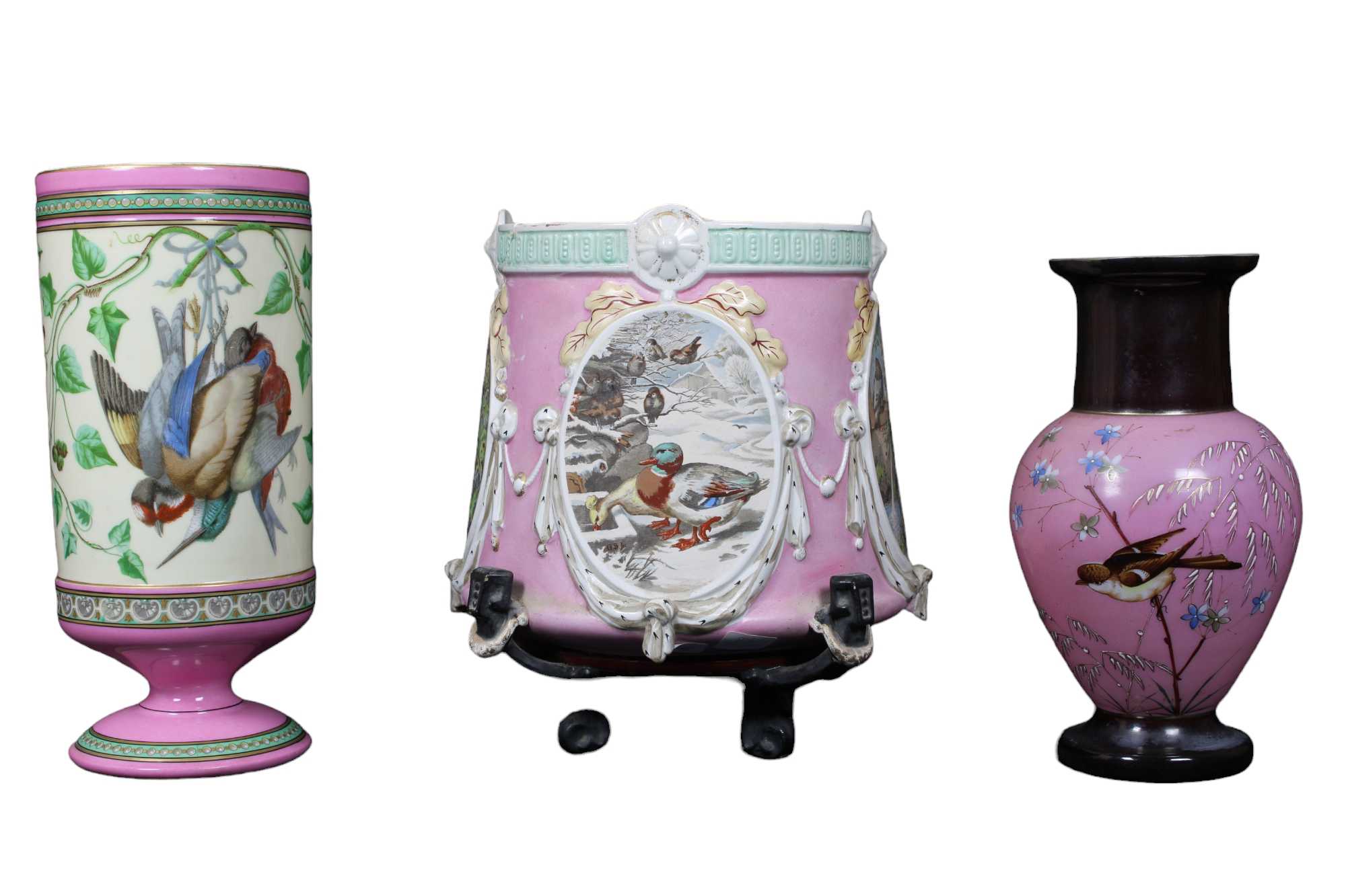 LOTTO COMPOSTO DA UN CENTROTAVOLA in porcellana dipinta dentro riserve decorata da flora e fauna, vecchio evidente restauro sul bordo, UN VASO in porcellana raffigurante natura morta con uccelli e vite ED 1 VASO in opaline dipinta con lumeggiature in oro manifatture francesi fine XIX secolo miure varie