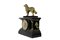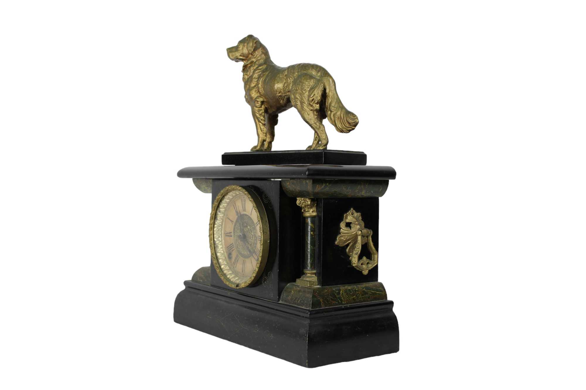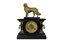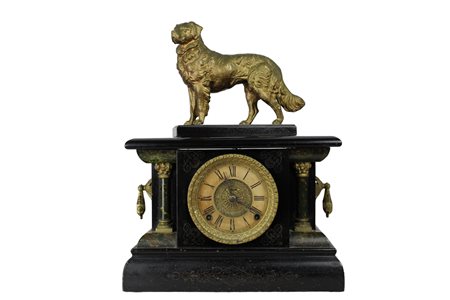OROLOGIO DA APPOGGIO con cassa in legno ebanizzato e laccato a finto marmo che sorregge scultura raffigurante cane in antimonio dorato, orologio funzionante da revisionare Francia fine XIX secolo h cm 47 x 36 x 17
