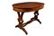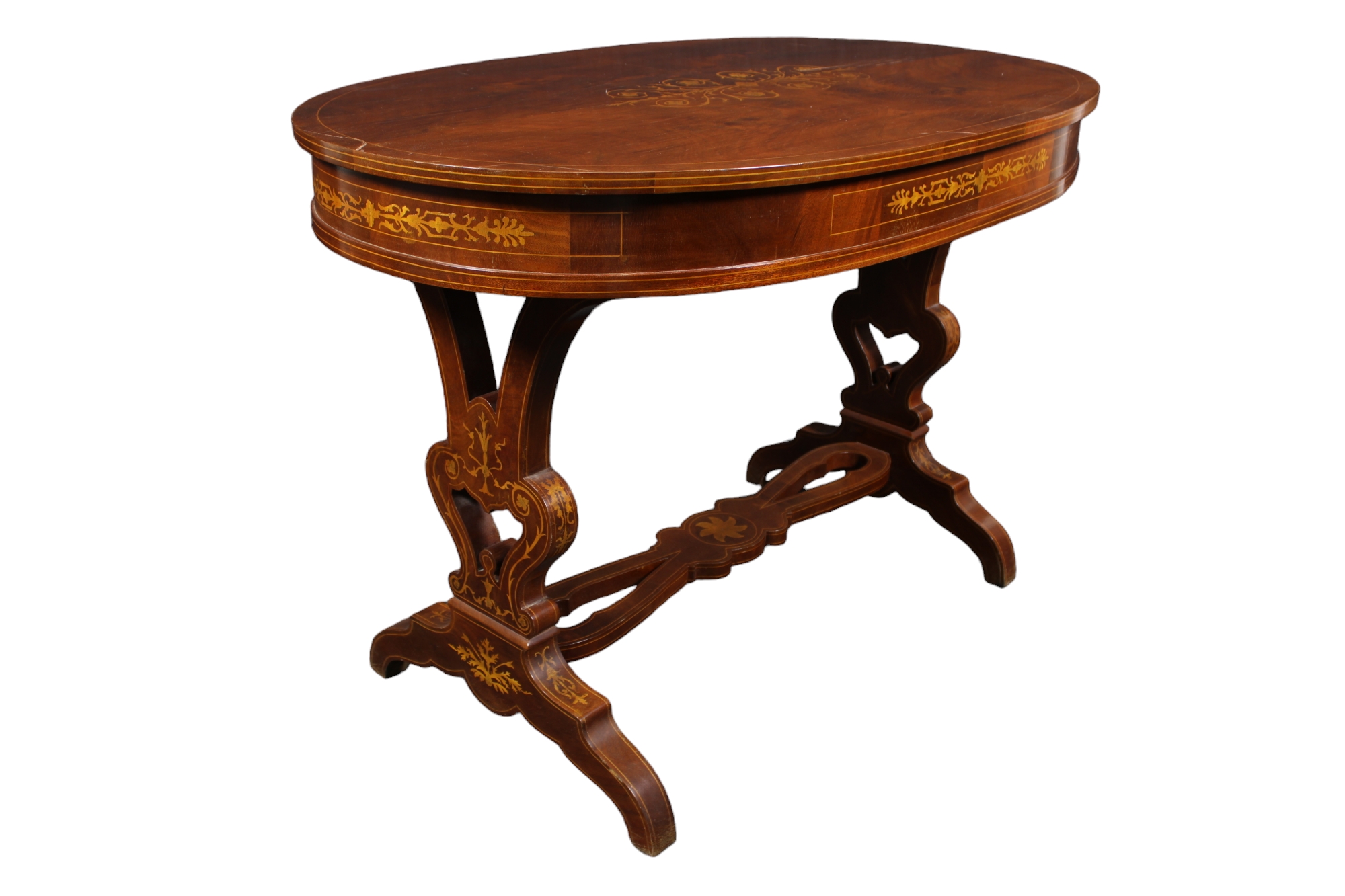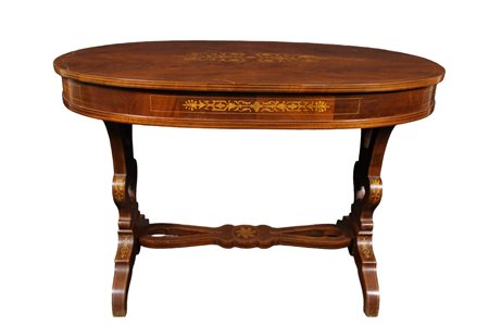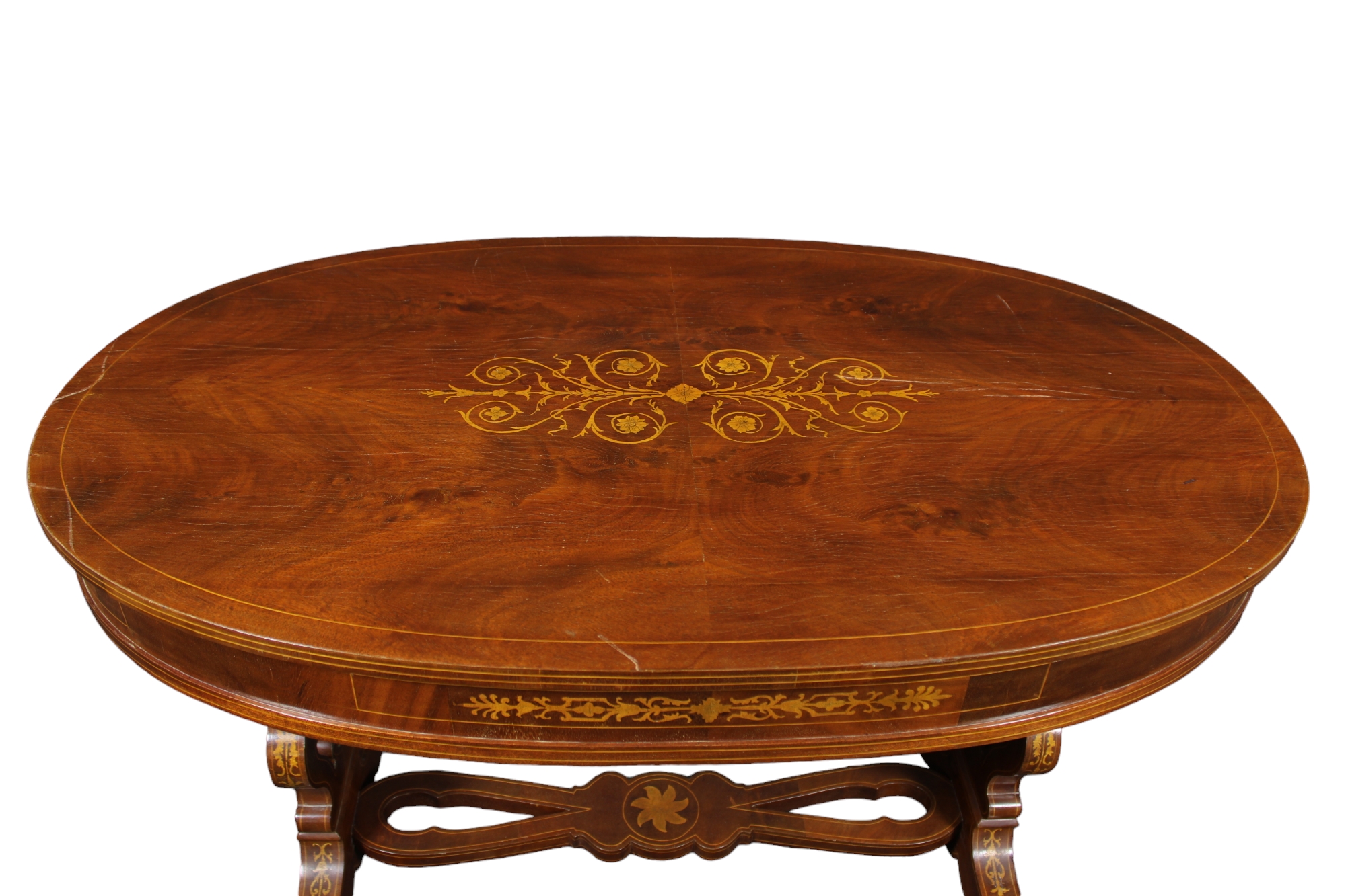 TAVOLO OVALE D'APPOGGIO in piuma di mogano con tarsie in bosso, gambe a lira raccordate da traversa di gusto Carlo X maestranze siciliane XX secolo h cm 73,5 x 119 x 66