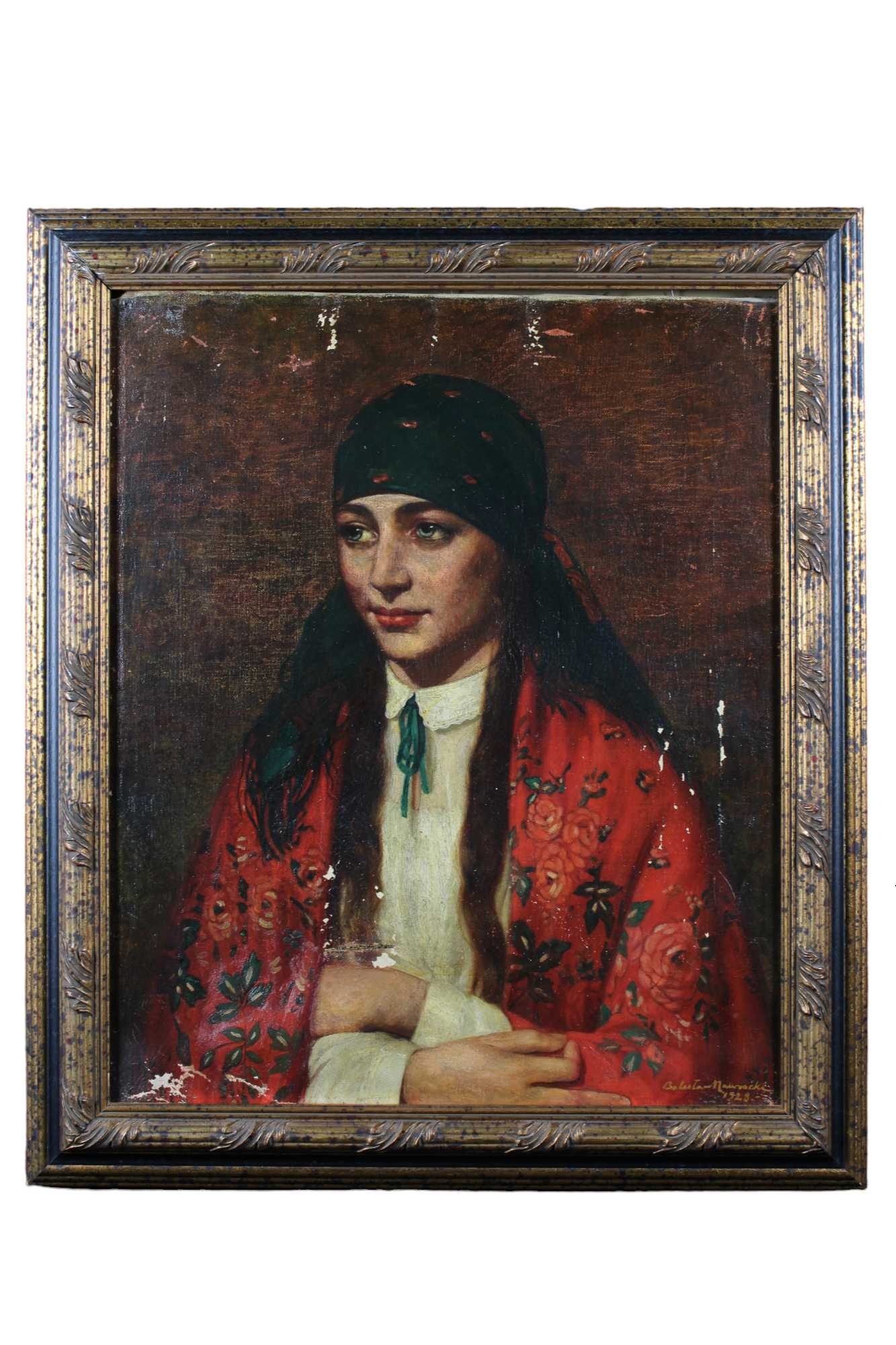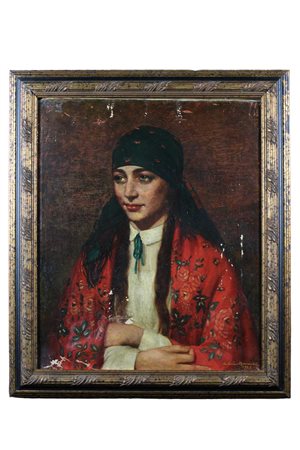 OLIO SU TELA raffigurante Gitana firmato in basso a d/x Bolutan Naucracki 1928 dentro cornice in legno laccato e dorato, difetti nella tela maestranze Est Europa h cm 63 x 52 / corncie h cm 77 x 65