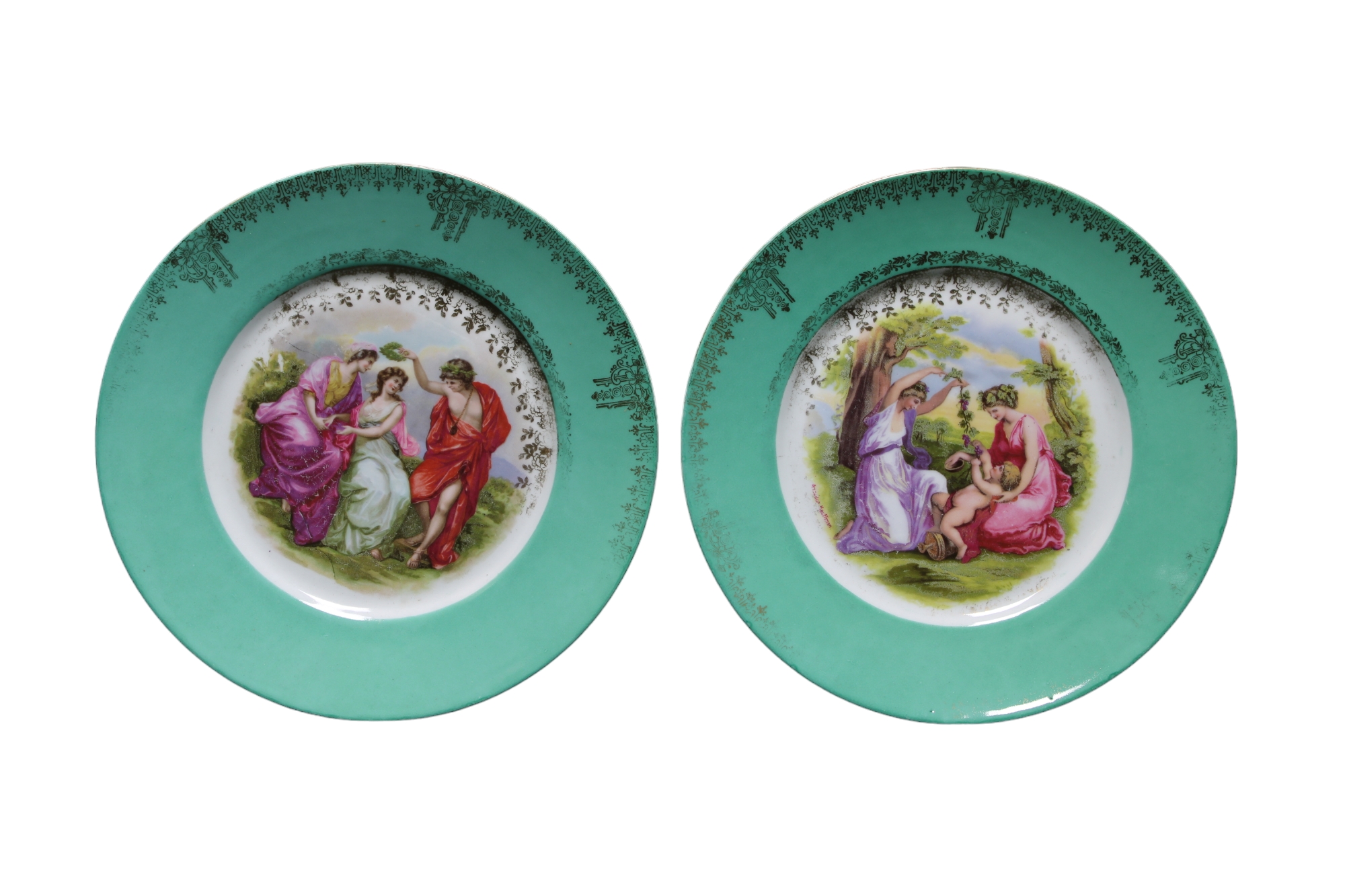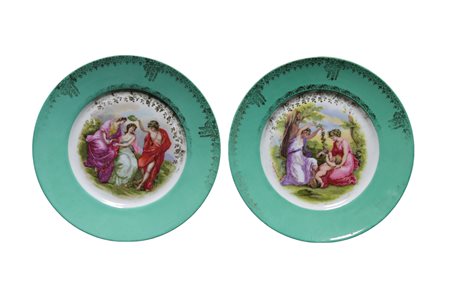 LOTTO DI 2 PIATTI in porcellana decorati con scene mitologiche, tesa verde e dorata manifattura inglese primi XX secolo Ø 25