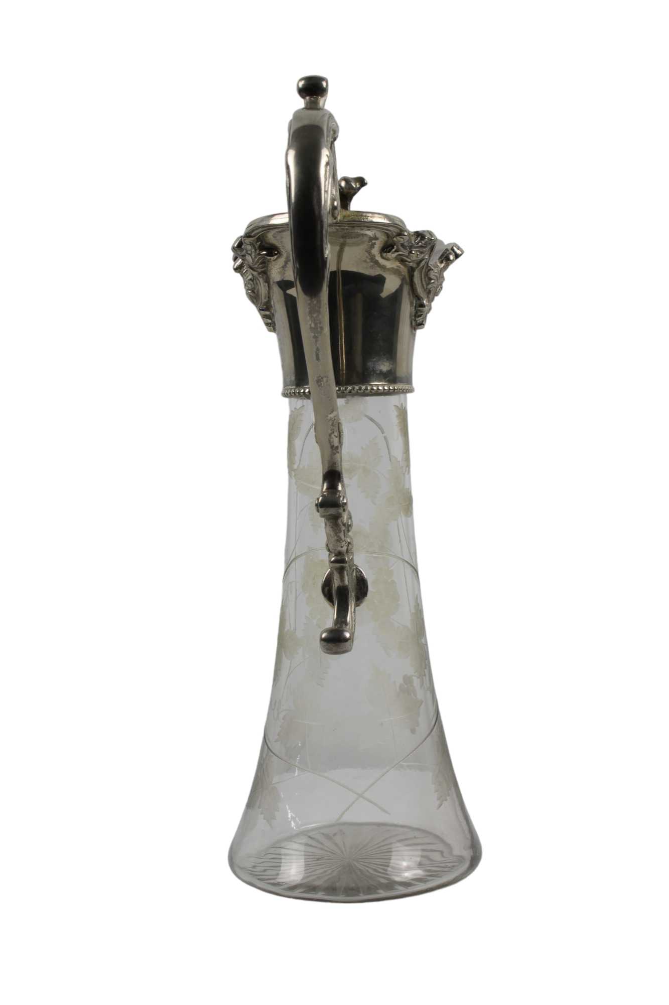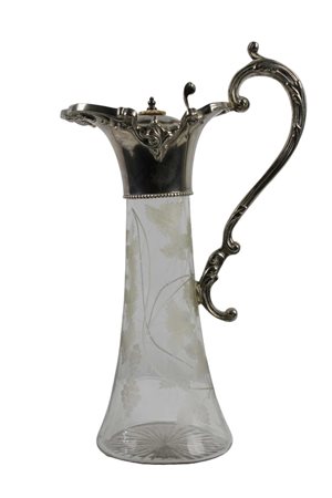 CURIOSA CARAFFA DA VINO in vetro inciso a motivi di vite e metallo cesellato e argentato Italia primi 900 h cm 38 x 23 x 13