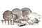 LOTTO DI DIVERSI OGGETTI IN ARGENTO, XX SECOLO, composto da due centrotavola, un piatto, un vassoio a due manici, una zuccheriera, una burriera con coperchio, un'oliera, una saliera su piedini, un secchiello porta ghiaccio, una formaggiera con coperchio, una paletta con spazzola per briciole, quattro salini americani zavorrati e quattro portauovo; difetti e lievi ammaccature.