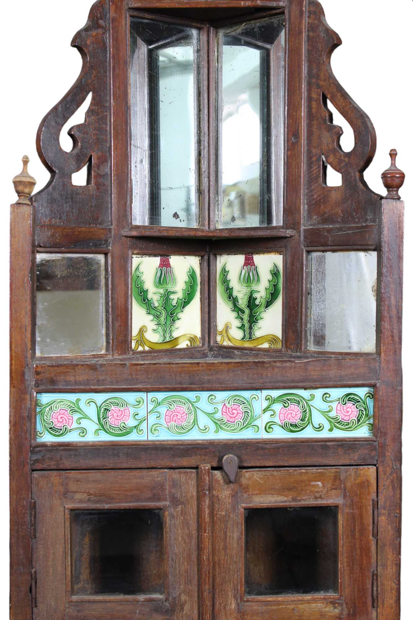 ANGOLIERA in legno di noce con applicazioni di formelle in ceramica maestranze siciliane primi 900 h cm 195 x 55 x 35
