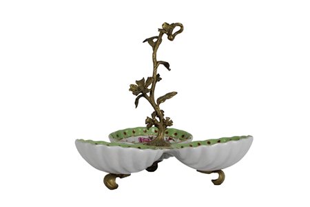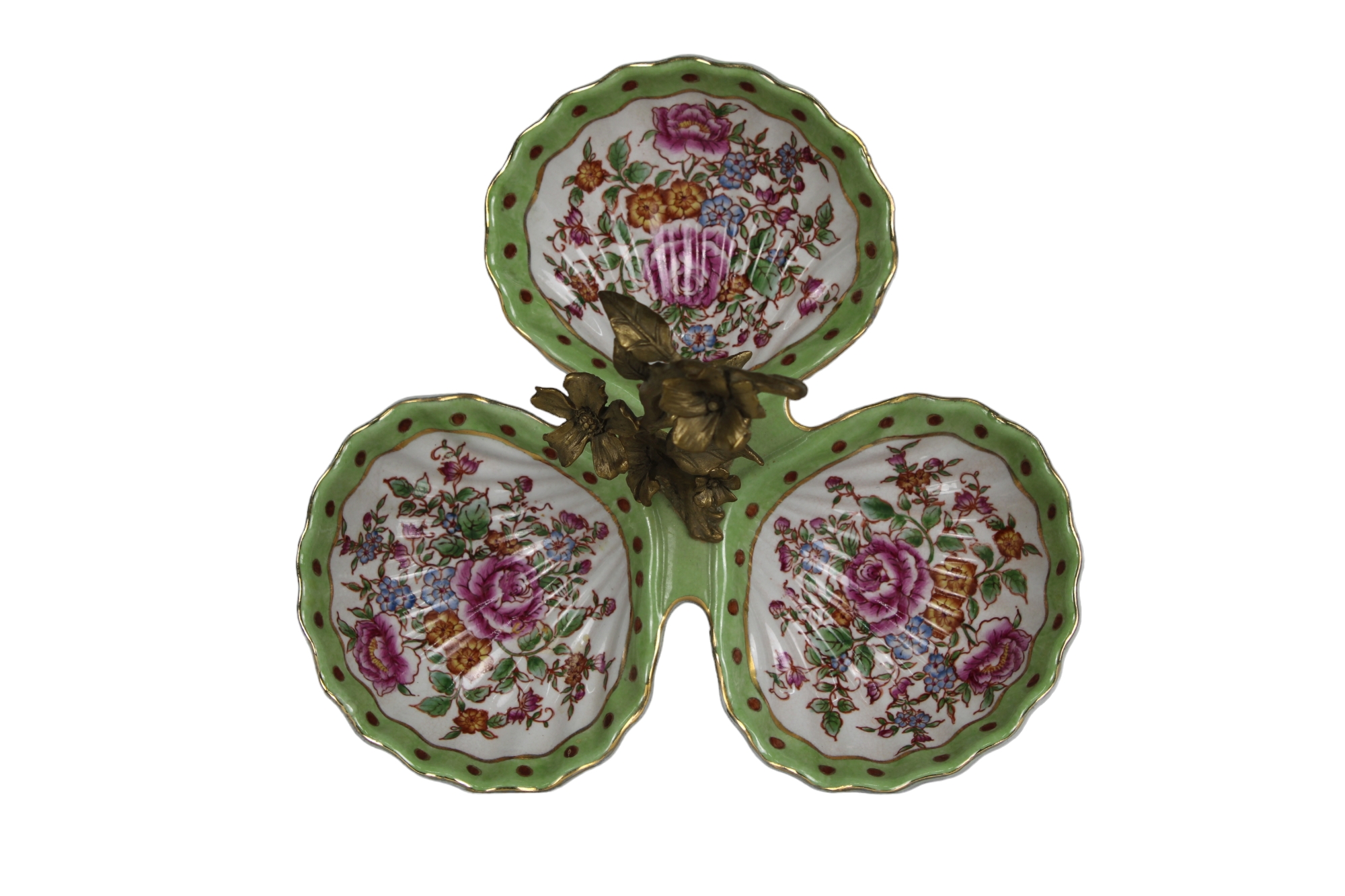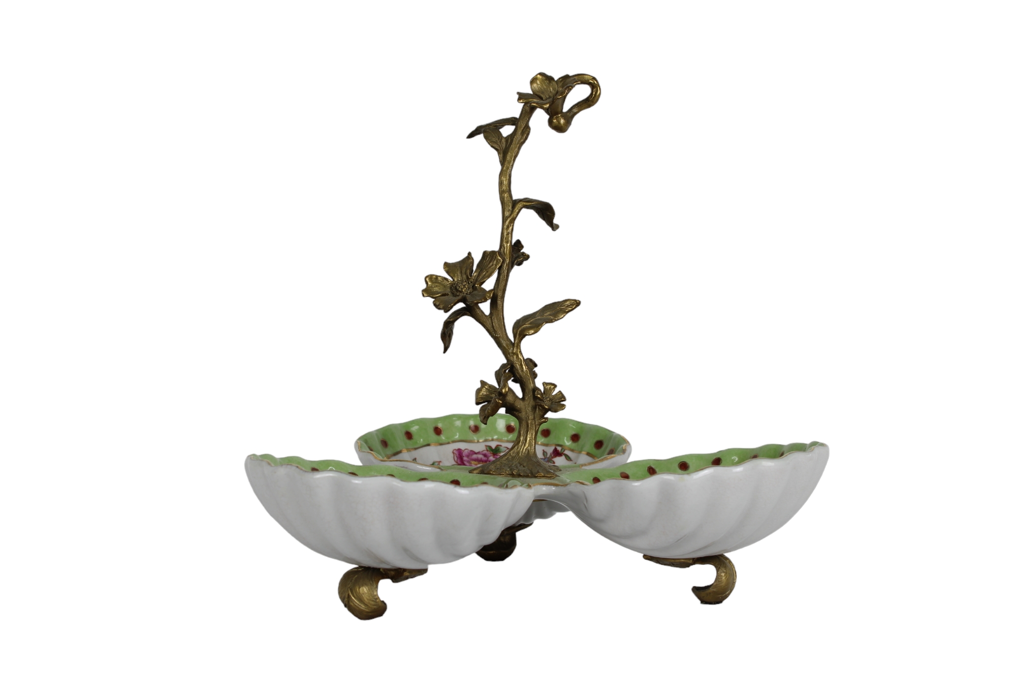 CENTROTAVOLA in porcellana dipinta a motivi floreali con lumeggiature in oro e applicazioni in bronzo manifattura probabilmente tedesca XX secolo h cm 26 x 29