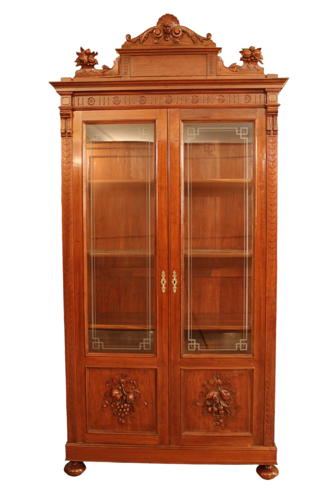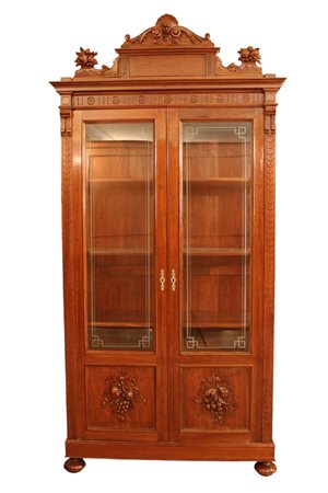 VETRINA A DUE ANTE in legno di noce riccamente scolpita e vetri incisi Sicilia 800 h cm 263,5 x 125 x 50
