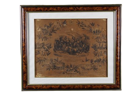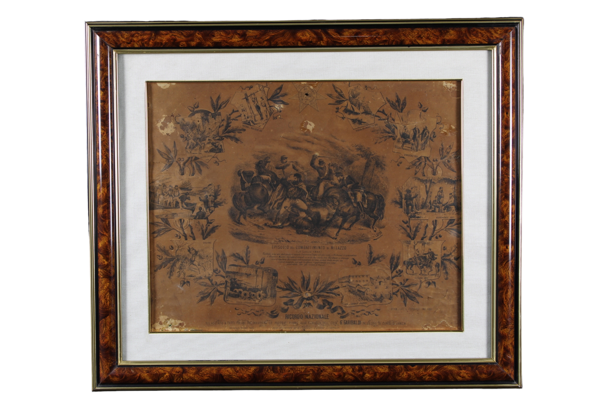 STAMPA COMMEMORATIVA raffigurante episodio del combattimento di Milazzo (ricordo nazionale a Giuseppe Garibaldi) dentro cornice non coeva Italia XIX secolo h cm 41 x 52