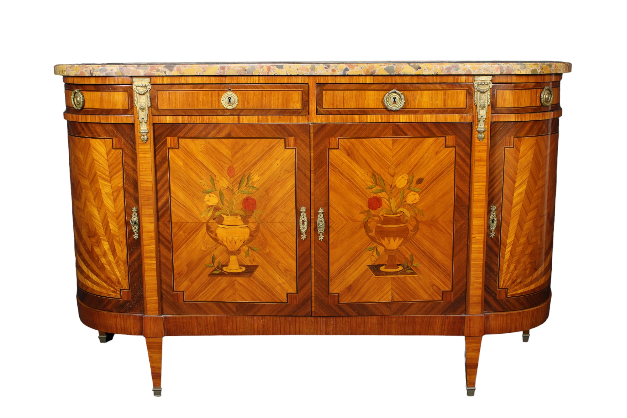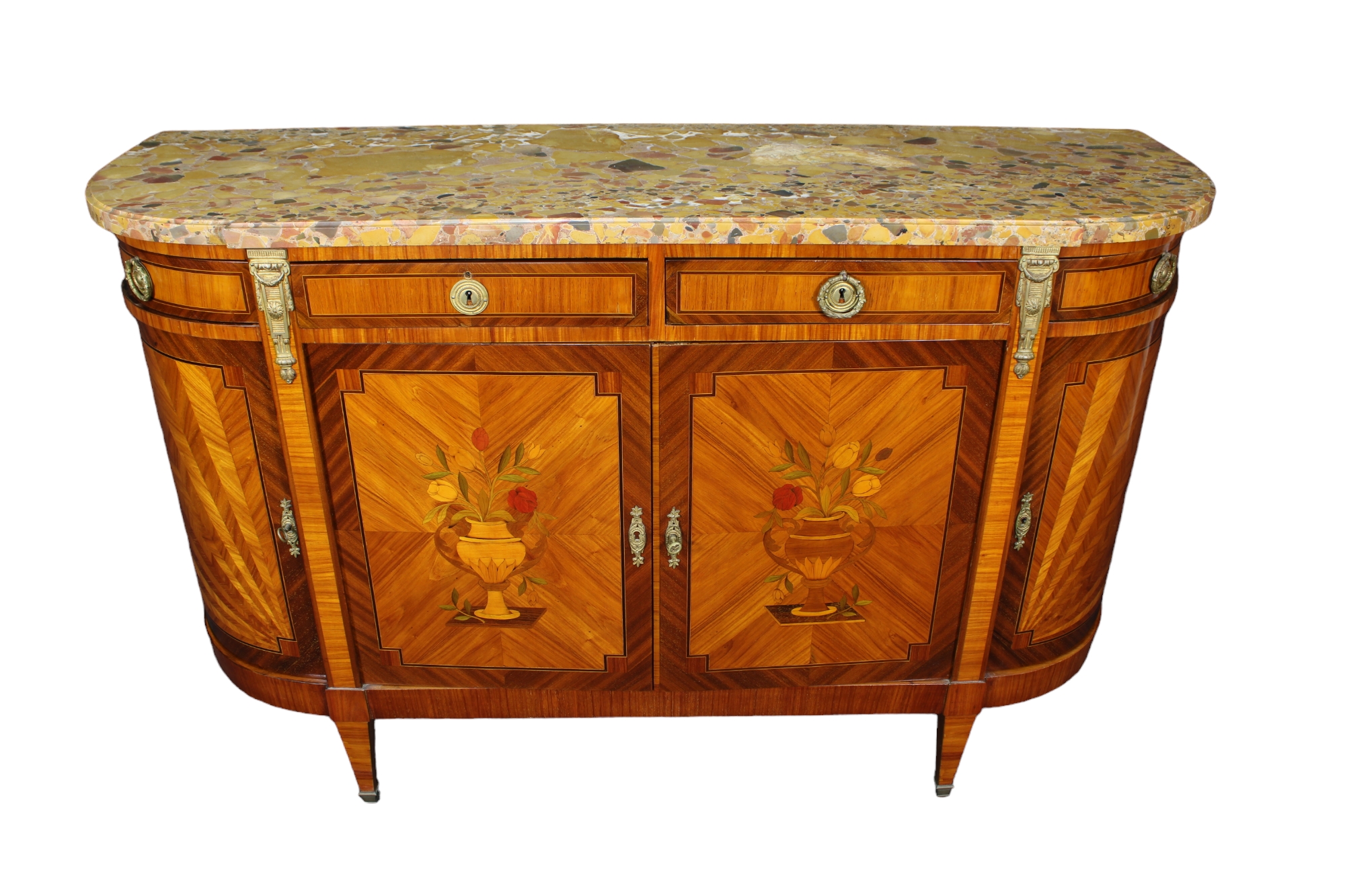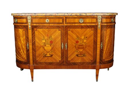 CREDENZA SCANTONATA A 4 SPORTELLI lastronata in bois de rose e riccamente intarsiata in varie essenze di legno e applicazioni in bronzo dorato piano in marmo breccia francese Francia XIX secolo h cm 102 x 168 x 54
