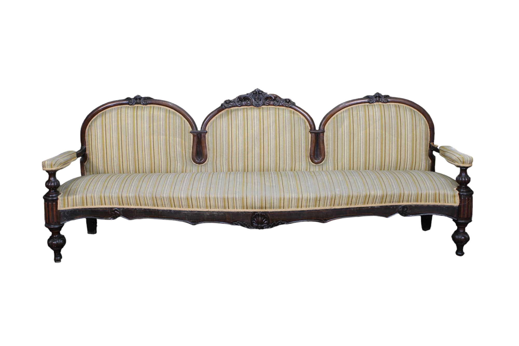 ELEGANTE DIVANO in massello di palissandro e perfilato in legno rosa finemente scolpito Sicilia primi 800 h cm 94 x 235 x 60