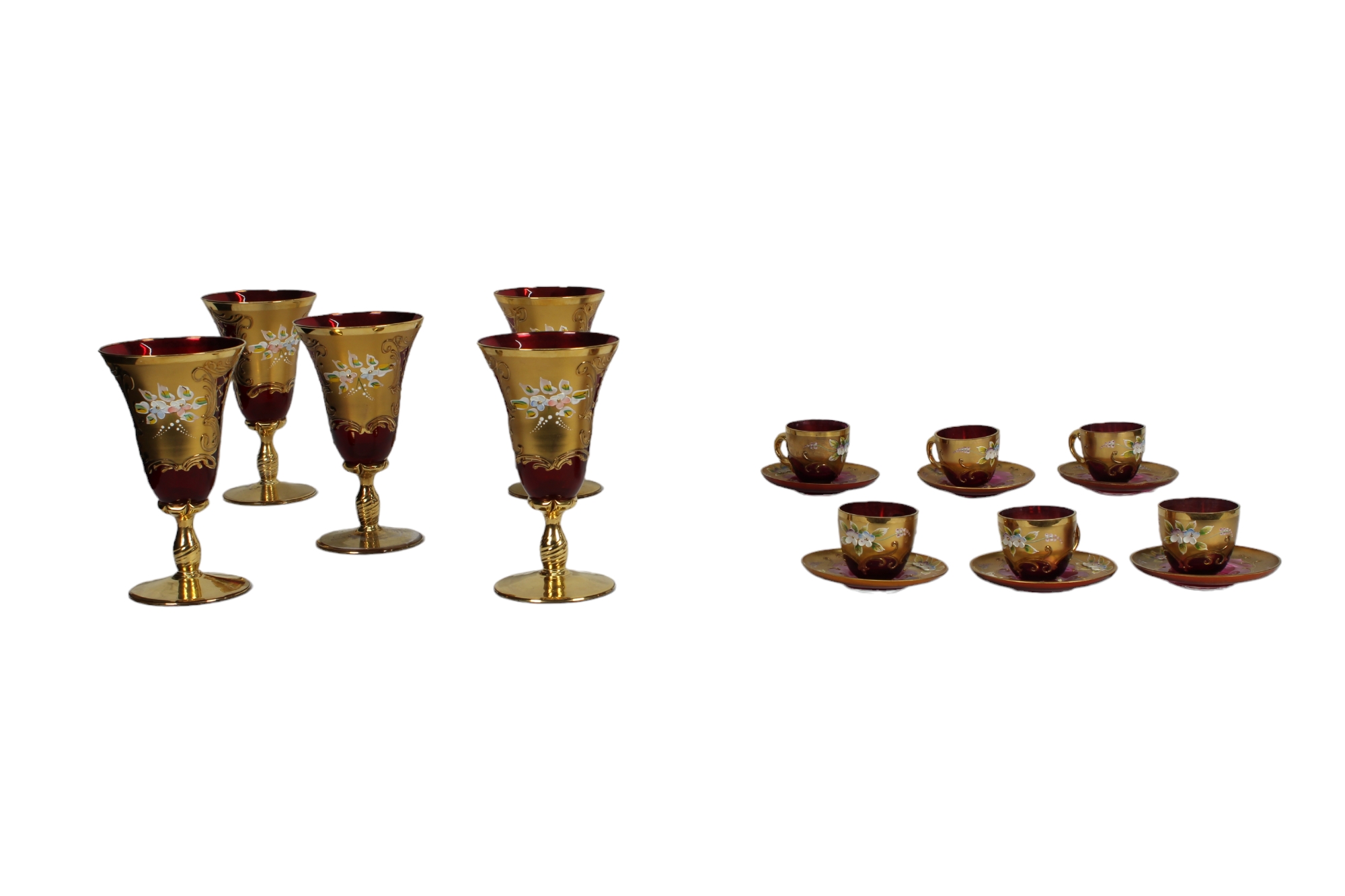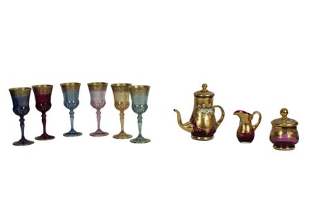 LOTTO COMPOSTO DA servizio da caffe e calici 20 pezzi, in vetro colorato e lumeggiato in oro Francia XX secolo misure varie