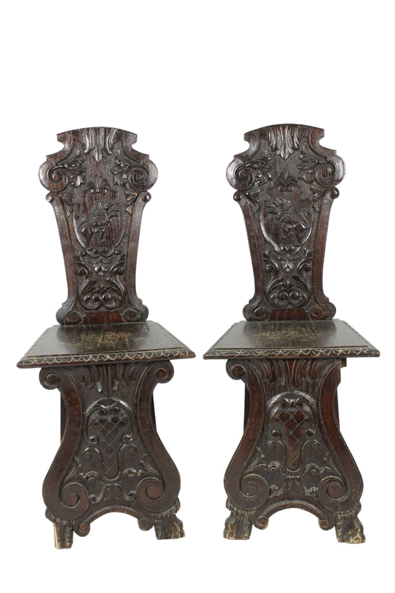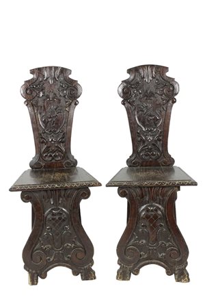 COPPIA DI SEDIOLINE di gusto rinascimentale in legno di noce riccamente scolpite Sicilia XIX / XX secolo h cm 98,5 x 39 x 40