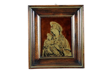 PITTURA SU VETRO lumeggiature in oro raffigurante Madonna con Bambino di gusto Baltico firma illegibile XX secolo h cm 47 x 42