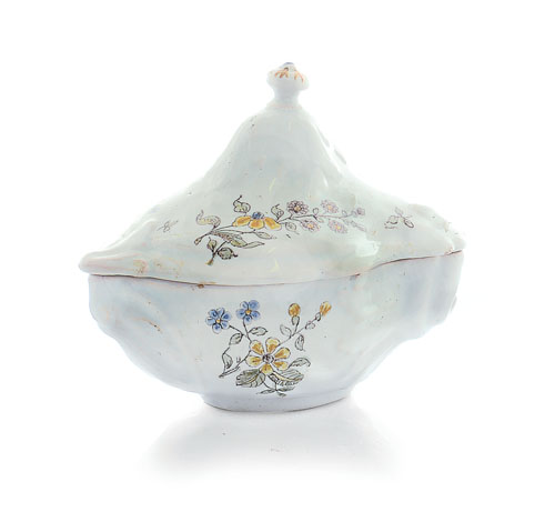 ZUCCHERIERA CON COPERCHIO IN MAIOLICA, NOVE DI BASSANO, XVIII SECOLO, sagomata con anse a conchiglia e decoro floreale policromo; fessura al coperchio.