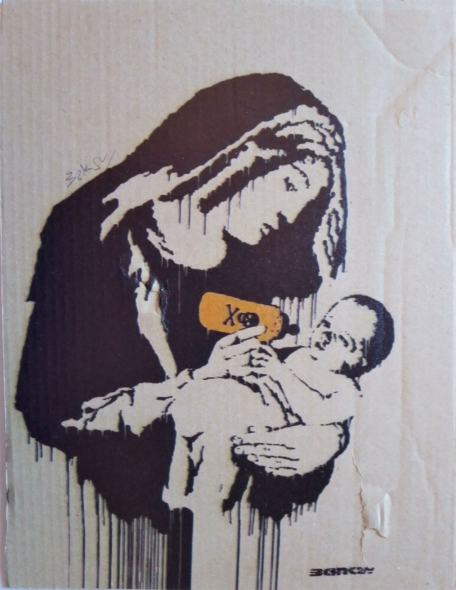 BANSKY (Bristol 1974) Spray Stencil Graffiti su Cartone CM 31x24,5 Tiratura Limitata a 20 -Titolo -La Vergine e Bambino- Al Fronte Timbro e Firma Bansky, al Retro Timbro Dismaland Free Art 2015-2020 Certificato Accluso